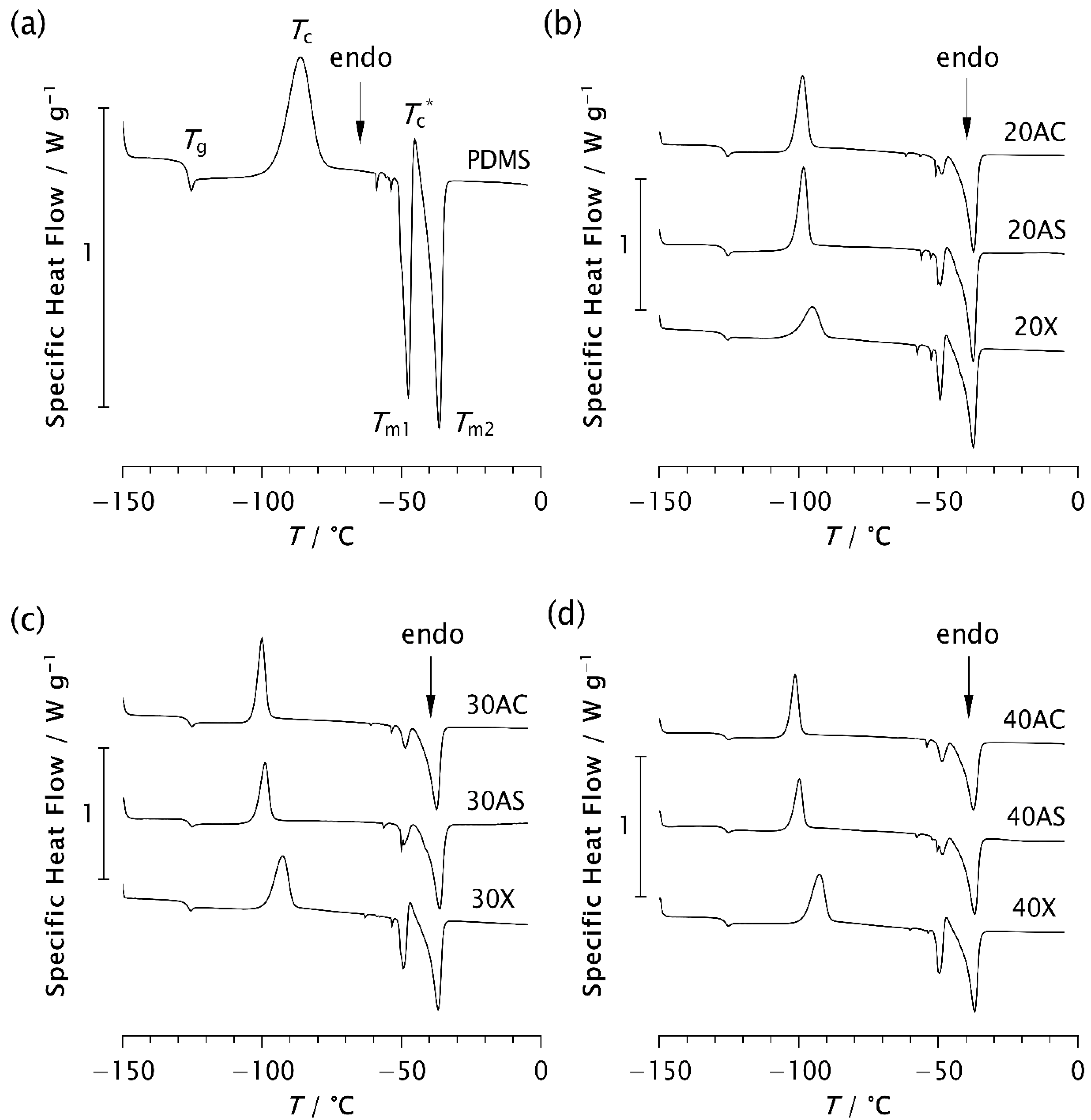 - Aranguren, M.I. Crystallization of Polydimethylsiloxane: Effect of Silica Filler and Curing. Polymer 1998, 39, 4897–4903. [Google Scholar] [CrossRef]