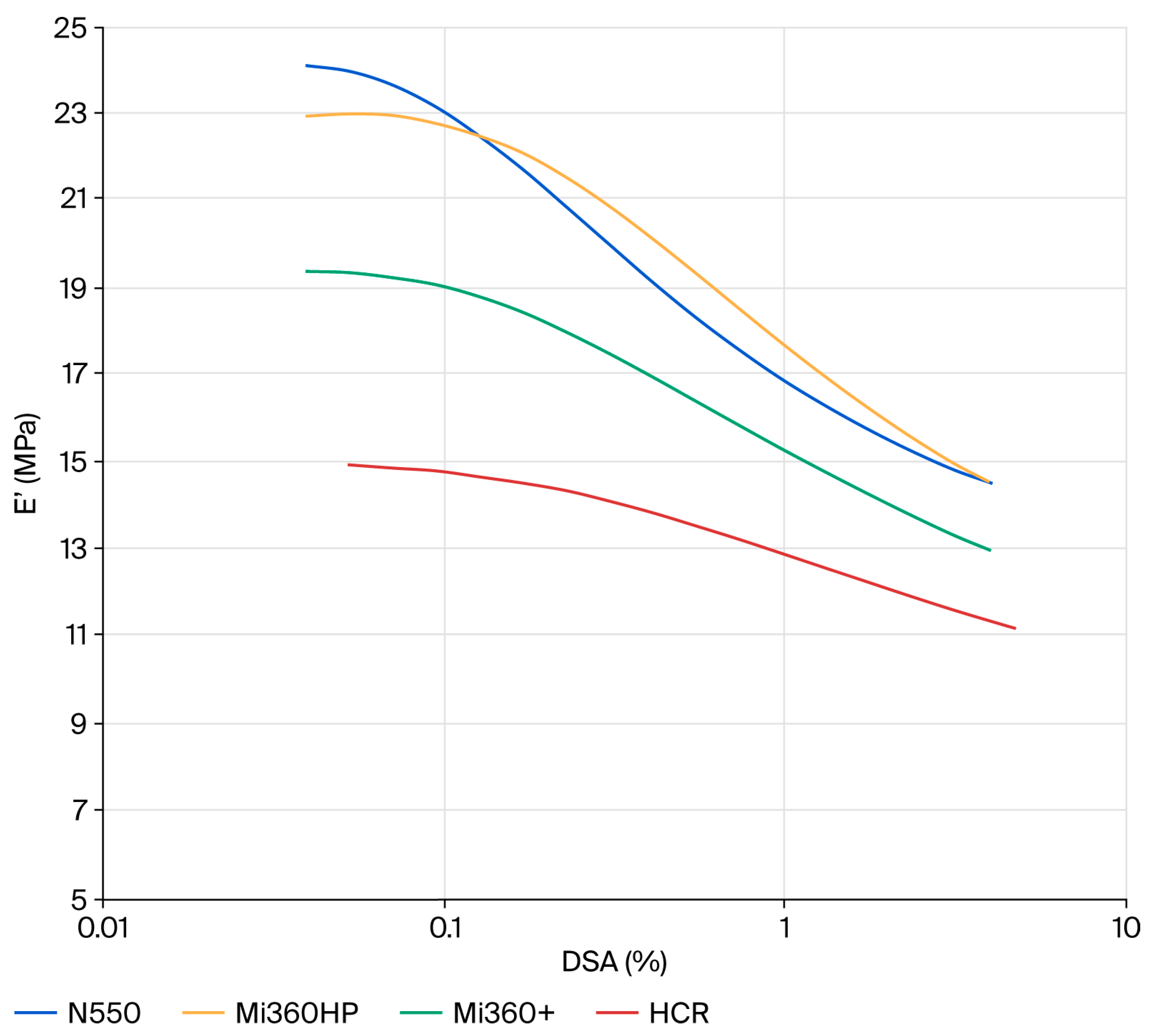 - Strain sweeps were conducted using a Perkin-Elmer DM8000 (Waltham, MA, USA) configured in tension mode. During this step, 2 × 2 × 10 mm specimens were tested at 40 °C, 10 Hz and a double strain amplitude (DSA) range of ~0.04 to 4%.