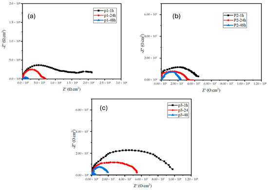 Nyquist plot for zinc-PVDF-G samples (a) P1, (b) P2, and (c) P3 in different immersion times.