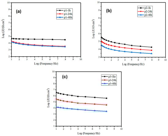 To evaluate the anticorrosion behaviour, the critical impedance modulus at the lowest frequency of the Bode diagram (|Z|0.01 Hz) is a crucial parameter, which is mentioned in the literature [37]. Figure 2a illustrates the p1 sample in the Bode module plot of the coatings. The sample exhibits a gradual decrease in the value of |Z|, suggesting that the corrosive medium might penetrate the interface of the coating and initiate a reaction with the substrate. Conversely, Figure 2b,c illustrate the p2 and p3 coating samples, where the initial |Z|0.01 Hz value of the coating increased by an order of magnitude when more graphene concentration was added. Furthermore, an additional characteristic that was observed in all the coating samples is presented in Figure 2. After 48 h of immersion, the value of |Z|0.01 Hz decreased progressively. The enhanced corrosion resistance is attributed to the physical barrier effect provided by the graphene. Initial low-frequency impedance moduli were greater for composite coatings containing zinc-PVDF-G functional filler. The modulus of low-frequency impedance for composite coatings decreased gradually after 48 h of immersion time. Despite a gradual decrease in low-frequency impedance values after 48 h of immersion across all samples, the coatings containing graphene (p2 and p3) maintain higher |Z|0.01 Hz values compared to p1. This indicates that the zinc-PVDF-G composite coatings provide more durable protection, even after prolonged exposure to the corrosive environment. Graphene’s inclusion thus plays a pivotal role in delaying the onset of corrosion, enhancing the longevity and efficacy of the coatings.