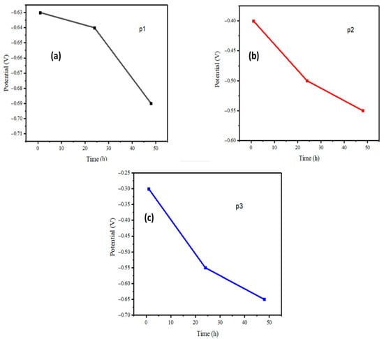 Average OCP evaluation plots of zinc-PVDF-G samples (a) p1, (b) p2 and (c) p3 in different immersion times.