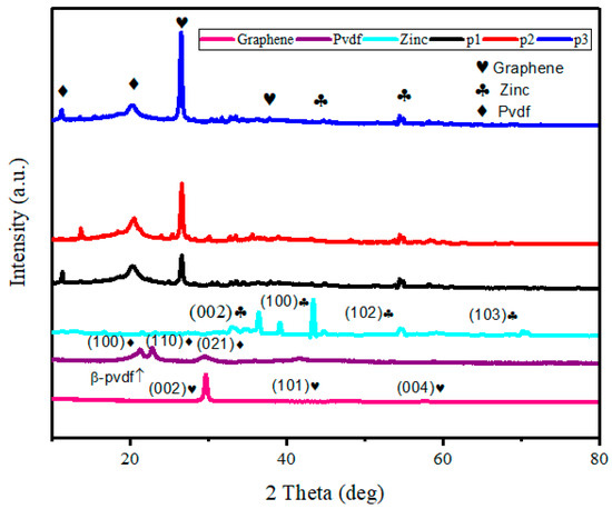 The XRD graphs of graphene, PVDF, zinc, and the p1, p2, p3 samples are shown in Figure 4. The XRD pattern of the graphene product exhibits one prominent peak, approximately 2θ = 28° and 2θ = 43.2°. These carbon peaks have been attributed to the (002) and (101) planes [38,39], whereas 2θ = 56.70° belongs to the plane (004) [40]. The PVDF graph shows the prominent peaks around 2θ = 21° belong to the plane (100), which indicates the beta phase [41]. The other two peaks at 2θ = 22.94° and 2θ = 29.35° belong to the plane (110) and (021), respectively [42]. The zinc graph shows the peaks at 2θ = 36.52°, 39.36°, 54.55°, 70.31° belong to the plane (002), (100), (102), (103), respectively [43]. Overall, it can be observed in samples p1, p2, and p3 that, as the concentration of graphene increases, the carbon peak intensity increases and the beta phase also becomes more prominent, and these samples clearly indicate the presence of graphene, zinc, and PVDF in the coated samples. In the composite samples (p1, p2, p3), an increase in graphene concentration is evidenced by the corresponding increase in the intensity of the carbon peaks. Additionally, the β-phase of PVDF becomes more pronounced with higher graphene content, as seen by the stronger peak at 2θ = 21°. This suggests that graphene incorporation enhances the crystallinity and phase composition of PVDF in the coating. Overall, the XRD patterns confirm the successful incorporation of graphene, zinc, and PVDF in the p1, p2, and p3 coatings, with increasing graphene content positively influencing the structure and properties of the samples.