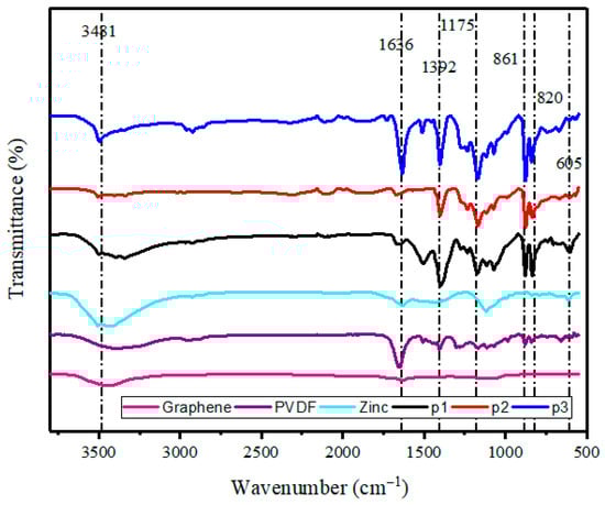 Figure 6 shows the FTIR spectra of the graphene, PVDF, zinc, p1, p2, and p3 samples. It can be seen in Figure 6 that the PVDF peaks show at 1392 cm−1 and 1175 cm−1, which belong to the C-H and C-F stretching and deformation [45]. These peaks are prominent in PVDF-, p1-, p2-, and p3-coated samples. The peaks at 3481 cm−1 and 1636 cm−1 correspond to the O-H and C=C Stretching vibrations [46]. The presence of two peaks at 820 cm−1 and 860 cm−1 corresponds to the α and β phases, respectively. It is evident that the incorporation of graphene filler results in a reduction in the intensity of the alpha phase, while the intensity of the beta phase increases [47]. The presence of an absorption band at 605 cm−1 can be attributed to the stretching mode of zinc. The intensity and position of these peaks change minimally among the coated samples, even when PVDF with graphene is applied onto a substrate composed of zinc. This indicates that the coating process did not significantly alter the structure and crystalline phase of the zinc particles [48]. Overall, the incorporation of graphene into the zinc-PVDF matrix enhances the β-phase of PVDF while maintaining the structural integrity of the zinc particles, as evidenced by the minimal changes in peak positions and intensities across the samples. This indicates that the coating process successfully retains the desired structural characteristics of both PVDF and zinc, while benefiting from the enhanced properties provided by the addition of graphene.