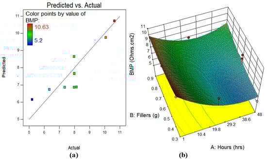 (a) Predicted against actual plots, (b) the 3D surface diagram for BMP analysis.