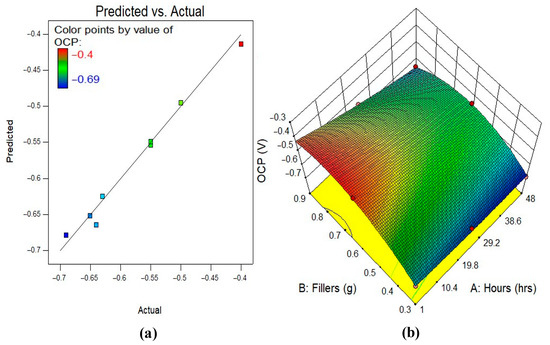 A 2D contour plot or 3D response surface plot may better show the response’s variable interaction. The 3D response surface plot shows the same data as the 2D contour plot. Figure 7, Figure 8 and Figure 9 illustrate the actual vs. anticipated diagnostic plot and 3D response surface diagrams of all response-predicting models in this study. As seen in the actual vs. projected plots, all constructed models have data points completely aligned to the line of fit, indicating a strong correlation between experimental data and model response data. Colour-coding represents regions on 3D response surface diagrams that reflect response intensities from input variable interaction. The greatest reaction intensities are in red, while the lowest are in blue. The figures show that the input factors’ interactions and effects on responses match the preceding talks on the variables’ effects on BMP, OCP, and EIS evaluation.