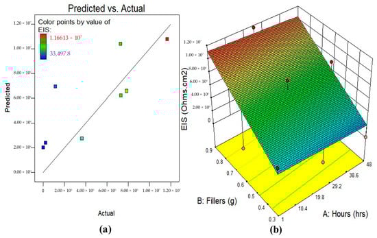 (a) Predicted against actual plots, (b) the 3D surface diagram for EIS analysis.