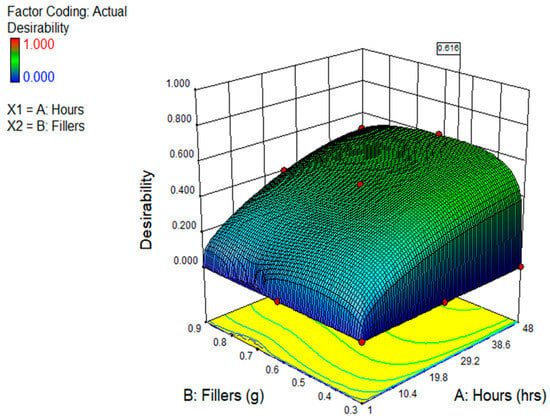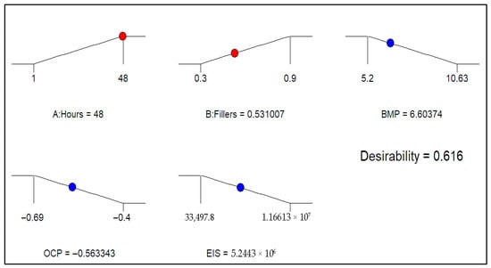 Table 6 illustrates the findings and also indicates that the optimisation’s objective functions were constructed in this case. By adjusting the input variables to 48 h and adding 0.53 g of graphene, the result shows that an ideal BMP, OCP, and EIS of 6.60 Ohms.cm2, −0.563 V, and 5.2443 × 106 Ohms.cm2 could be achieved, with a high desirability value of 61.60%. Figure 10 displays the optimisation solution ramps, while Figure 11 displays the desirability findings.