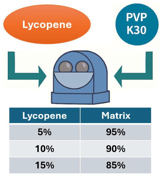Three lycopene–PVP K30 systems were prepared containing 5% (30 mg of lycopene and 570 mg of polymer), 10% (60 mg of lycopene and 540 mg of polymer), and 15% (90 mg of lycopene and 510 mg of polymer) lycopene by weight (Figure 1). For each formulation, the weighed components were placed on weighing paper using an analytical powder balance, transferred to an agate mortar, and manually ground for 10 min until a homogeneous powder was obtained. The resulting systems were then transferred to a 25 mL grinding cylinder containing two 10 mm diameter balls. Grinding was carried out in a ball mill (Mixer Mill MM 400, Retsch GmbH, Haan, Germany) at an operating frequency of 30 Hz for a total of 90 min, divided into three 30 min cycles with 10 min breaks between stages to prevent overheating. All procedures were carried out under low-light conditions. After completion, each system was transferred to an Eppendorf tube for further analysis.