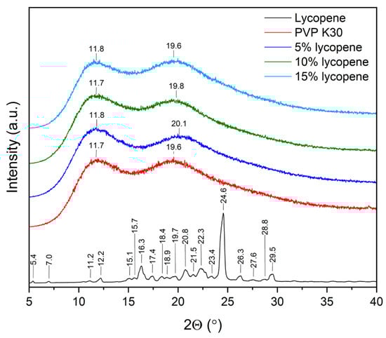 Powder X-ray diffraction was employed to confirm the disruption of the crystalline structure and the molecular dispersion of lycopene within the polymer matrix within the investigated systems. Diffractograms of pure lycopene, PVP K30, and lycopene–polymer formulations containing 5%, 10%, and 15% lycopene were recorded under identical conditions.
