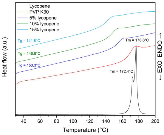The thermogram of the lycopene, pure PVP K30, and tested systems with increasing polymer content are presented in Figure 3.