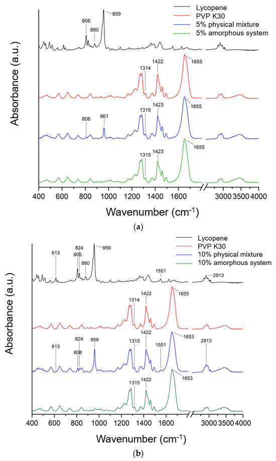 FTIR spectra recorded for lycopene, PVP K30, and their mechanical mixtures and amorphous systems in tested concentrations are presented in Figure 4.