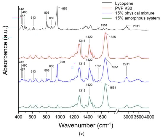 To confirm the interactions between lycopene and the polymer, spectra of the pure substances (lycopene and PVP K30) were compared with those of the mechanical mixture and the processed system.