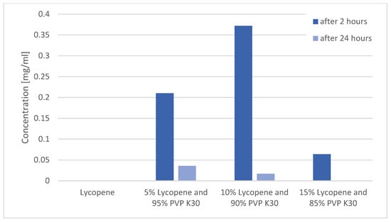 After 2 h, the highest concentration of dissolved lycopene was observed for the 10% lycopene system (0.210 ± 0.010 mg/mL). A comparable value was obtained for the 5% lycopene system (0.372 ± 0.010 mg/mL). The lowest concentration was recorded for the 15% lycopene system (0.064 ± 0.008 mg/mL).