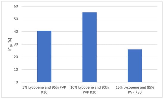 Among the lycopene–PVP K30 formulations, the highest antioxidant activity was observed for the 10% lycopene system, which achieved 55.18 ± 0.83% radical scavenging at the highest tested concentration (0.7797 mg/mL). This value corresponds to the IC50 of the system, indicating that over half of free radicals were neutralized at this concentration.