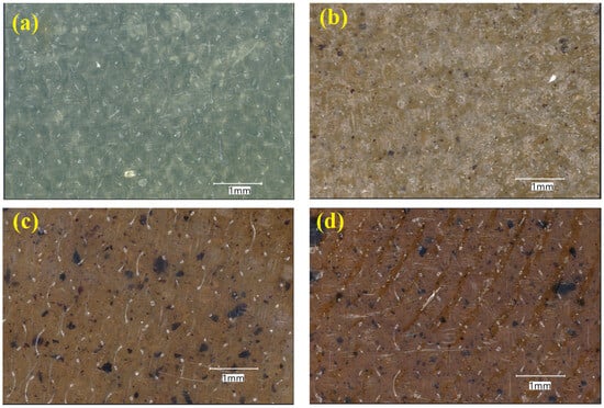 Figure 1 shows optical microscope images of PVA/lignin films with varying lignin loadings. The neat PVA film (Figure 1a) had a smooth and homogenous surface with no obvious phase separation, indicating excellent film-forming capabilities. Following the incorporation of 0.5 wt% lignin (Figure 1b), tiny dark domains corresponding to lignin particles were seen scattered throughout the PVA matrix. These domains were rather fine and equally distributed, indicating good compatibility with low lignin concentration.