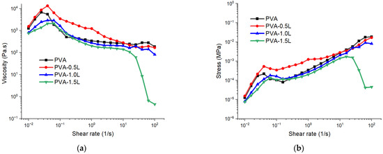 The flow-sweep test results for PVA and PVA/lignin samples at various shear rates are shown in Figure 2. PVA or PVA/lignin samples display shear-thinning behaviour (viscosity decreases with increasing shear rate), typical for polymer solutions and nano composites. The relation between apparent viscosity (η) and shear rate (˙γ) for a shear rate of 0.01–100 1/s is depicted in Figure 2a.