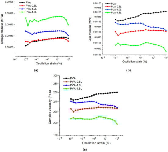 Dynamic strain-sweep plots of: (a) complex viscosity, (b) loss modulus and (c) storage modulus for PVA and PVA/lignin samples at strain range of 0.1–100%.