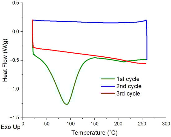 Figure 4 presents DSC curves of lignin particles for all heating and cooling cycles. The first heating cycle shows a sharp peak at around 100 °C due to the removal of moistures already inside the lignin particles. However, this peak disappears at the second heating cycle (3rd cycle) as expected. Although some of the works in the literature indicate that the glass transition temperature (Tg) of lignin is between 50 and 180 °C [61,62,63,64], it is quite difficult to observe a sharp peak to calculate the Tg of the lignin for this study.