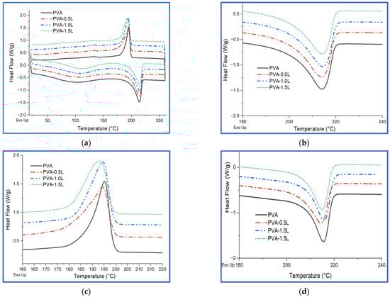 DSC curves of PVA and PVA/lignin blends: (a) 1st heating and cooling cycle together, (b) 1st heating cycle, (c) cooling cycle, and (d) 2nd heating cycle.