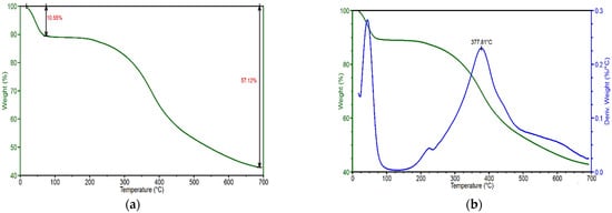 Figure 6 shows the thermogravimetric measurement of lignin particles at various phases of mass loss. The first mass loss (10.55%) is attributed to moisture evaporation at roughly 90 °C, as illustrated in Figure 6a. After the first weight loss, the degradation process is slowed between 100 and 200 °C. The second mass loss begins at around 225 °C as lignin decomposes to volatile water, carbon dioxide, and char, and continues until 400 °C (Figure 6b). According to derivative thermal gravimetric analyses (DTGA), lignin pyrolysis begins around 378 °C, as illustrated in Figure 6b. This temperature (378 °C) also represents the temperature at which the highest rates of weight change (decomposition temperature) for lignin occur. At 700 °C, more than 40% of lignin samples survive due to the formation of extremely condensed aromatic structures.