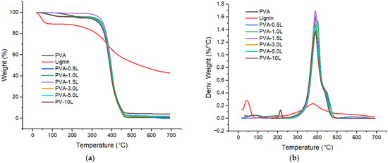 Table 3 and Figure 7 compare the decomposition temperature (Td) and char ratios for PVA and other samples including 3%, 5% and 10% of lignin loadings at 700 °C. Decomposition onset temperature of pure PVA is around 351 °C with the pyrolysis starting at around 393 °C. It is observed that the rate of the weight loss of neat lignin due to thermal degradation is lower than that of the PVA, as shown in Figure 7a. The derivative curve of PVA is exhibited at a higher temperature than that of lignin; it is 393 °C for PVA and 378 °C for lignin as presented in Table 3 and Figure 7b.