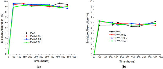 Moisture absorption ratios of PVA and PVA/lignin mixtures at (a) 85% and 85 °C and (b) 75% and 75 °C conditions.