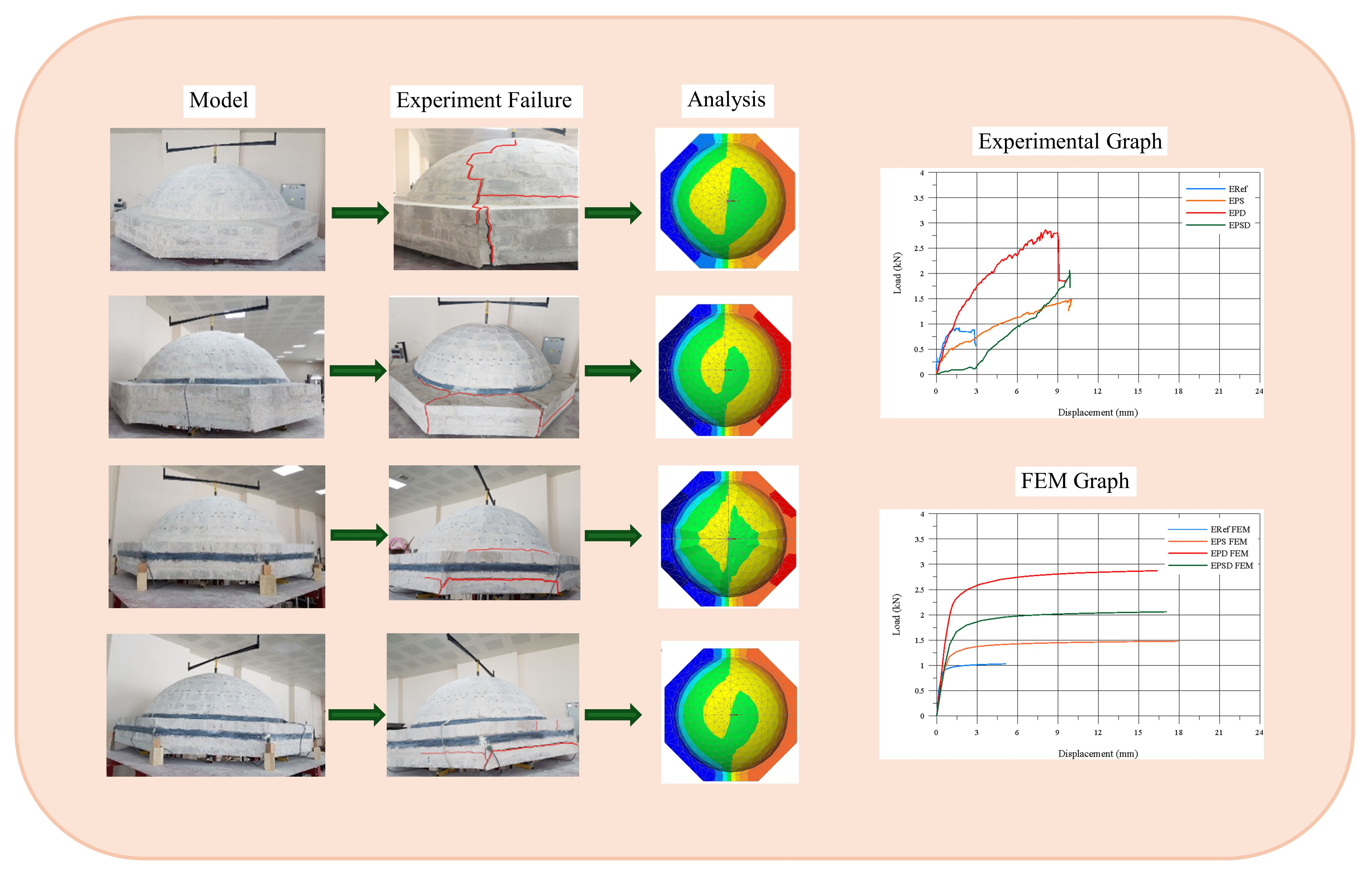 - This study focused on experimental and numerical analyses, but future research should also consider analytical solution methods to provide a more comprehensive evaluation of the effects of different modeling approaches. Additionally, by varying the geometric dimensions of the CFRP materials, the impact of dimensional differences on structural performance can be investigated, allowing for determination of the optimal strengthening parameters for dome behavior.