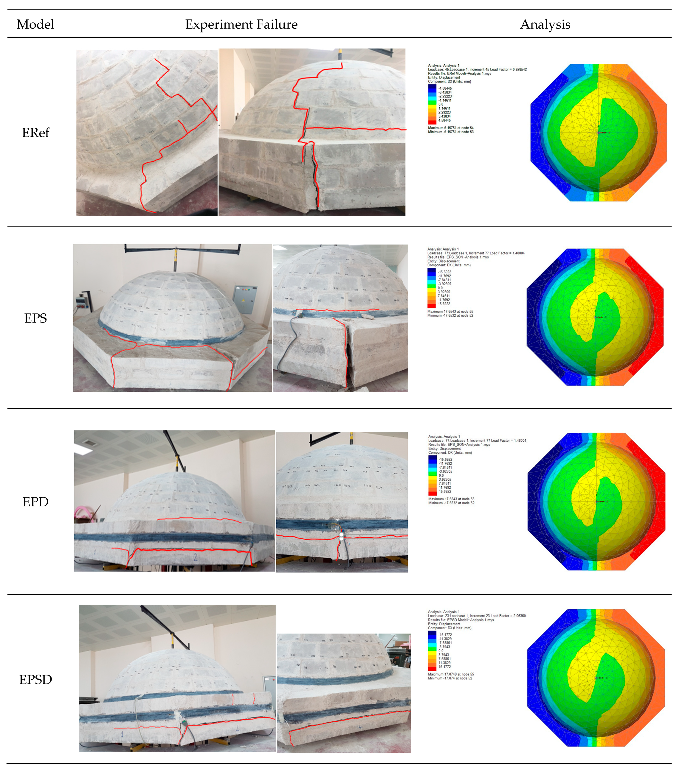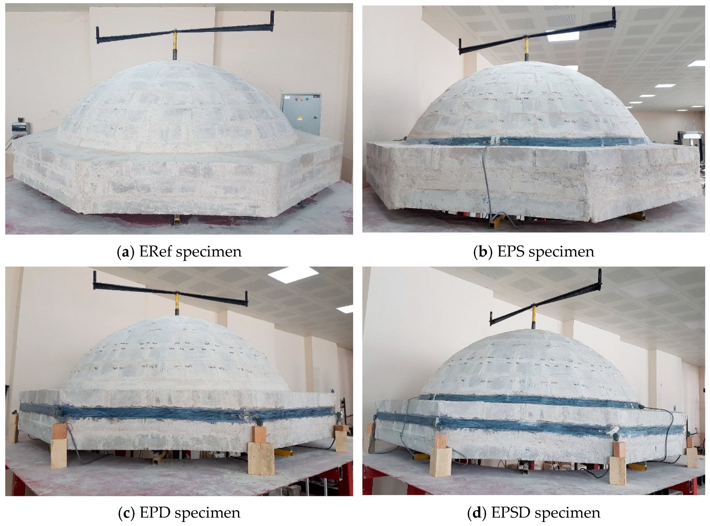 - Evaluation of damage formation in the domes showed that cracks in the CFRP-reinforced specimens occurred mainly in the tensile zones. The cracks were particularly concentrated in the skirt region, the upper part of the body wall, and the corners of the domes, with the crack openings varying depending on the reinforcement zone. In this context, the EPSD specimen experienced the least damage, while the EPS specimen showed the highest number of cracks and overall damage. In the EPSD specimen, reinforcing both the skirt and drum regions limited the dome’s tendency to open and provided more effective protection of structural integrity.