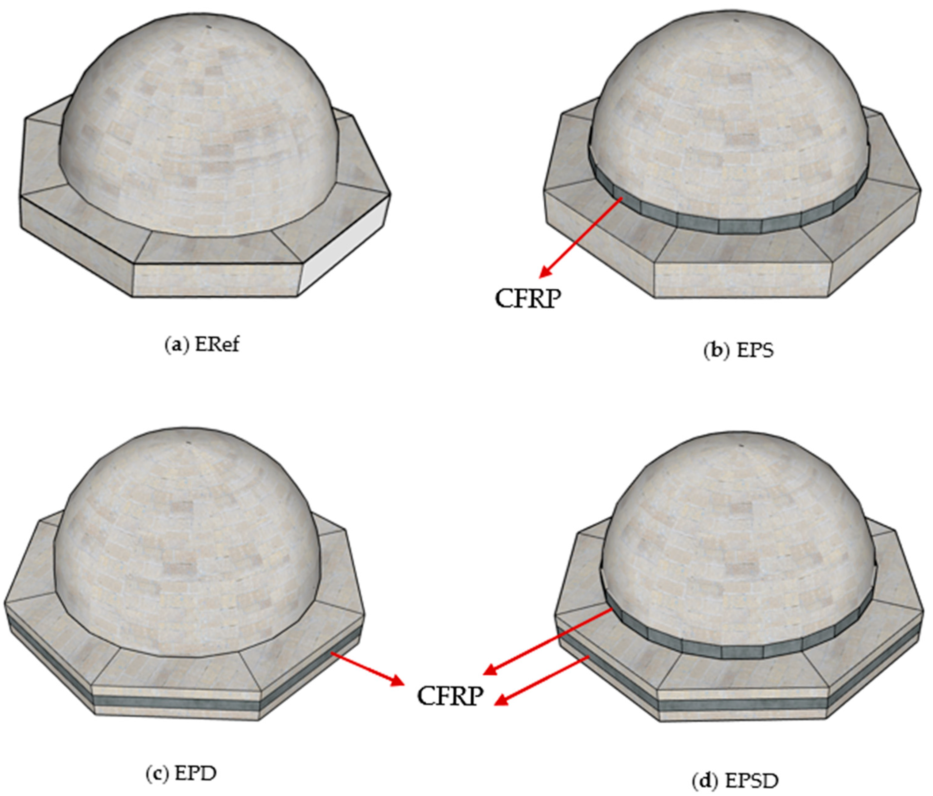 - Future research will focus on dynamic testing to evaluate the seismic performance of masonry domes strengthened with CFRP materials. Additionally, hybrid CFRP techniques and regional reinforcement optimization will be explored to identify the most effective strengthening methods. Their long-term durability under environmental conditions will also be assessed to develop sustainable intervention strategies. These efforts aim to contribute significantly to the preservation of historic domes.