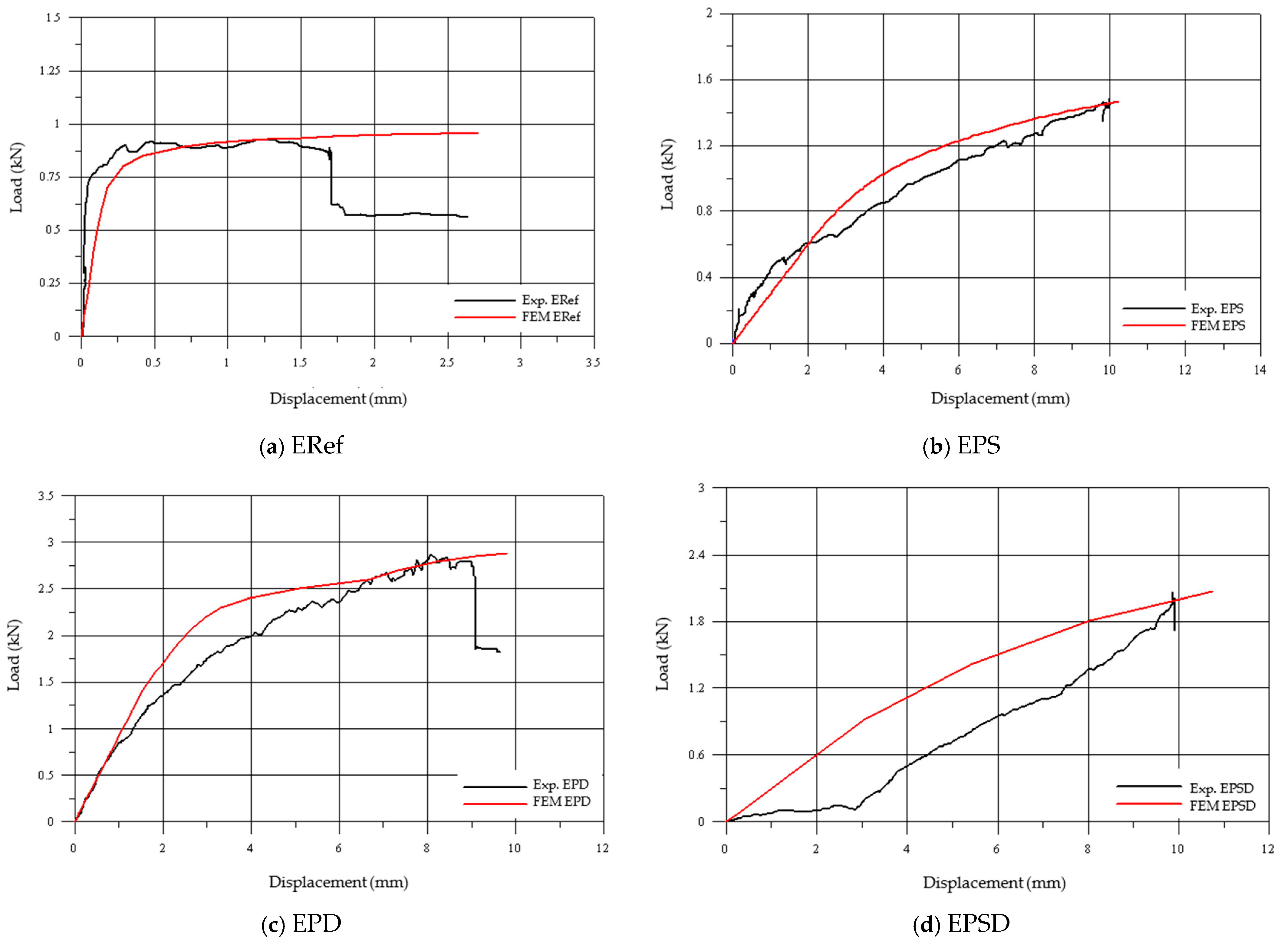 - Comparison of the experimental results with the numerical analysis obtained using the finite element method showed that the displacement values increased in parallel with the load in both models. The displacement values, particularly at maximum load levels, were found to be very close. Furthermore, the load–displacement curves from the experimental and numerical analyses largely overlapped, demonstrating that the developed finite element model successfully captured the experimental behavior.