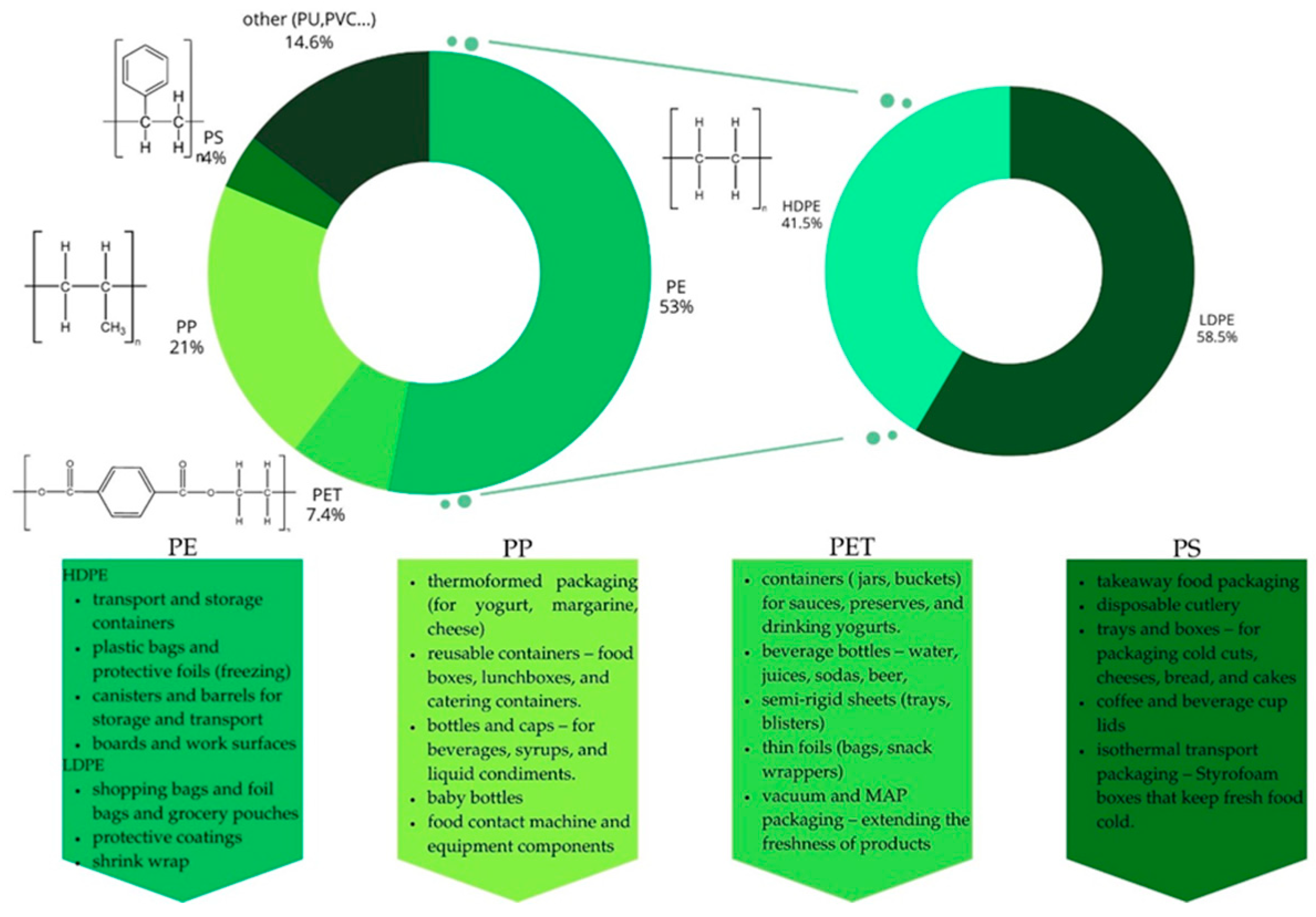 14]. In the food sector, the most commonly used plastics include PE, PP, PS, and PET (