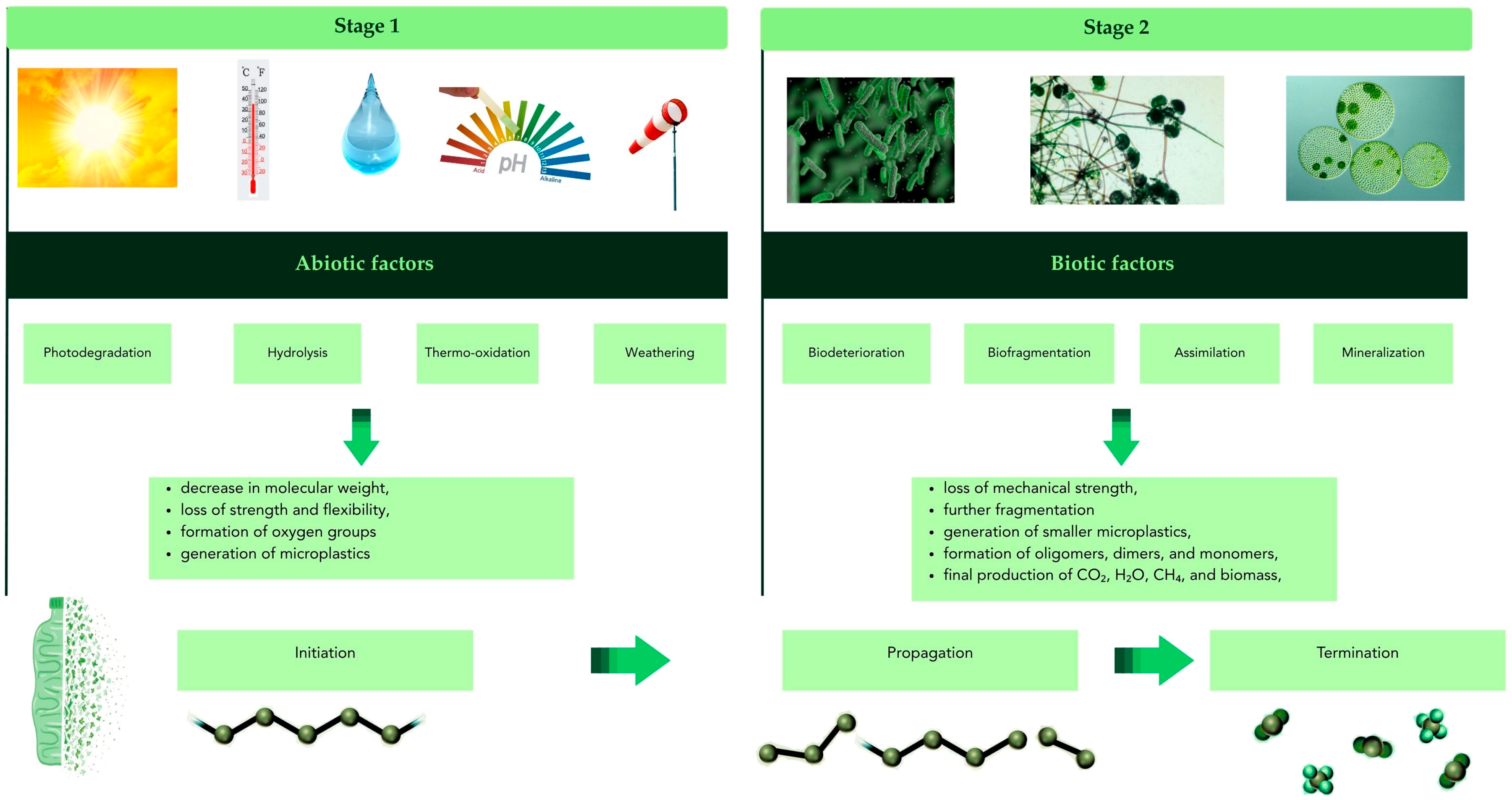 Biotic degradation significantly impacts the mechanical strength and hydrophobicity of the material, alters its appearance, and increases brittleness. These changes, occurring at the molecular level, lead to a loss of mechanical properties, which in turn facilitates fragmentation and the generation of smaller micro- and nanoplastics. These processes are responsible for the breakdown of waste polymers into compounds with even smaller molecular weights (oligomers, dimers, monomers), which can then be metabolized by microorganisms (biotic factors) (