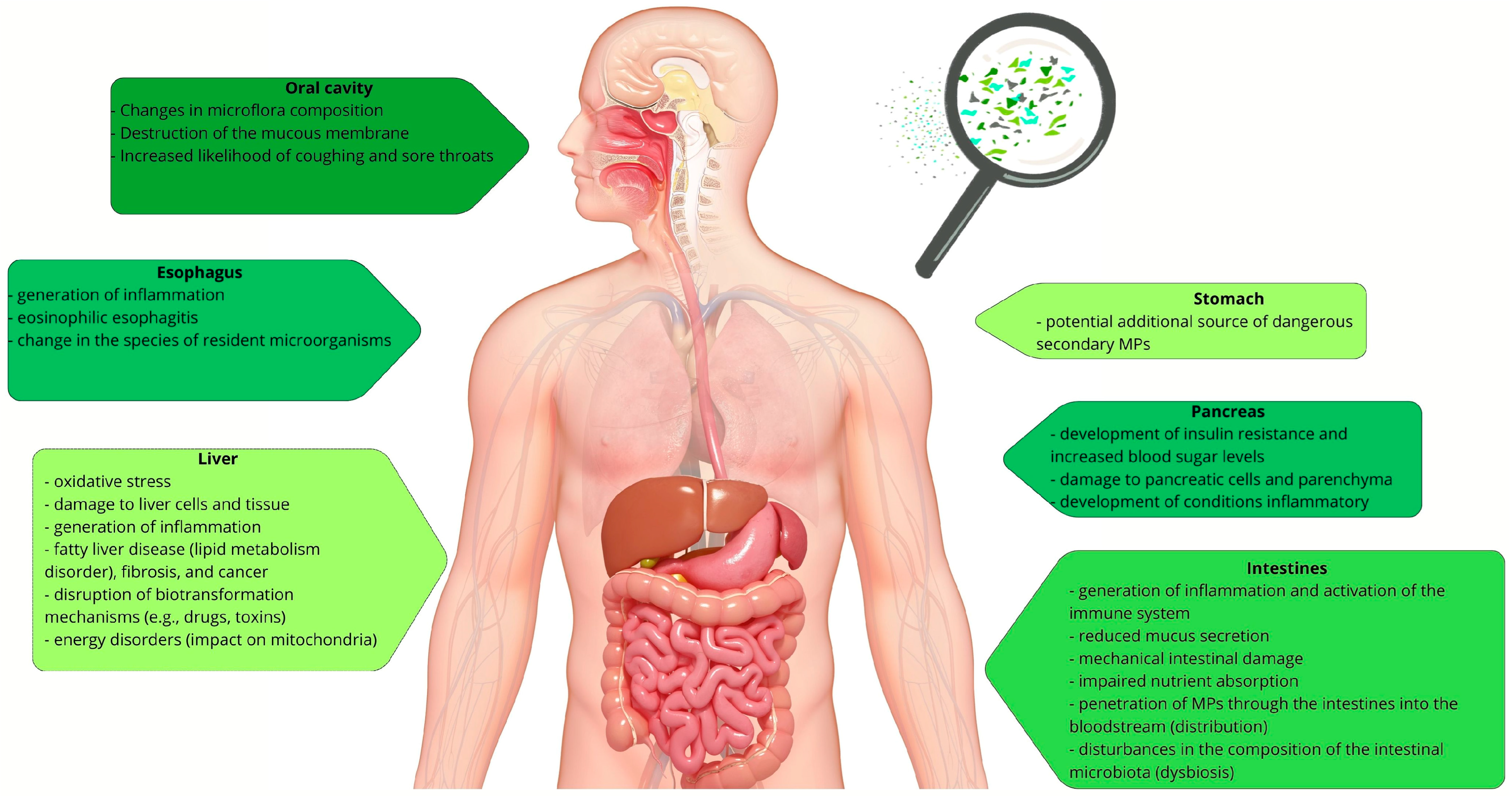 Studies confirm the presence of MP fragments in every part of the digestive system. Although there is currently no clear evidence linking the consumption of plastic particles to human health, the results of experiments on animal models, correlational studies with individuals exposed to high levels of MPs, and observations of cell lines suggest that the effects of MP exposure include numerous reactions in the gastrointestinal tract correlated with the development of diseases such as intestinal inflammation, obesity, diabetes, allergic reactions, circulatory diseases, autoimmune diseases, and cancer [