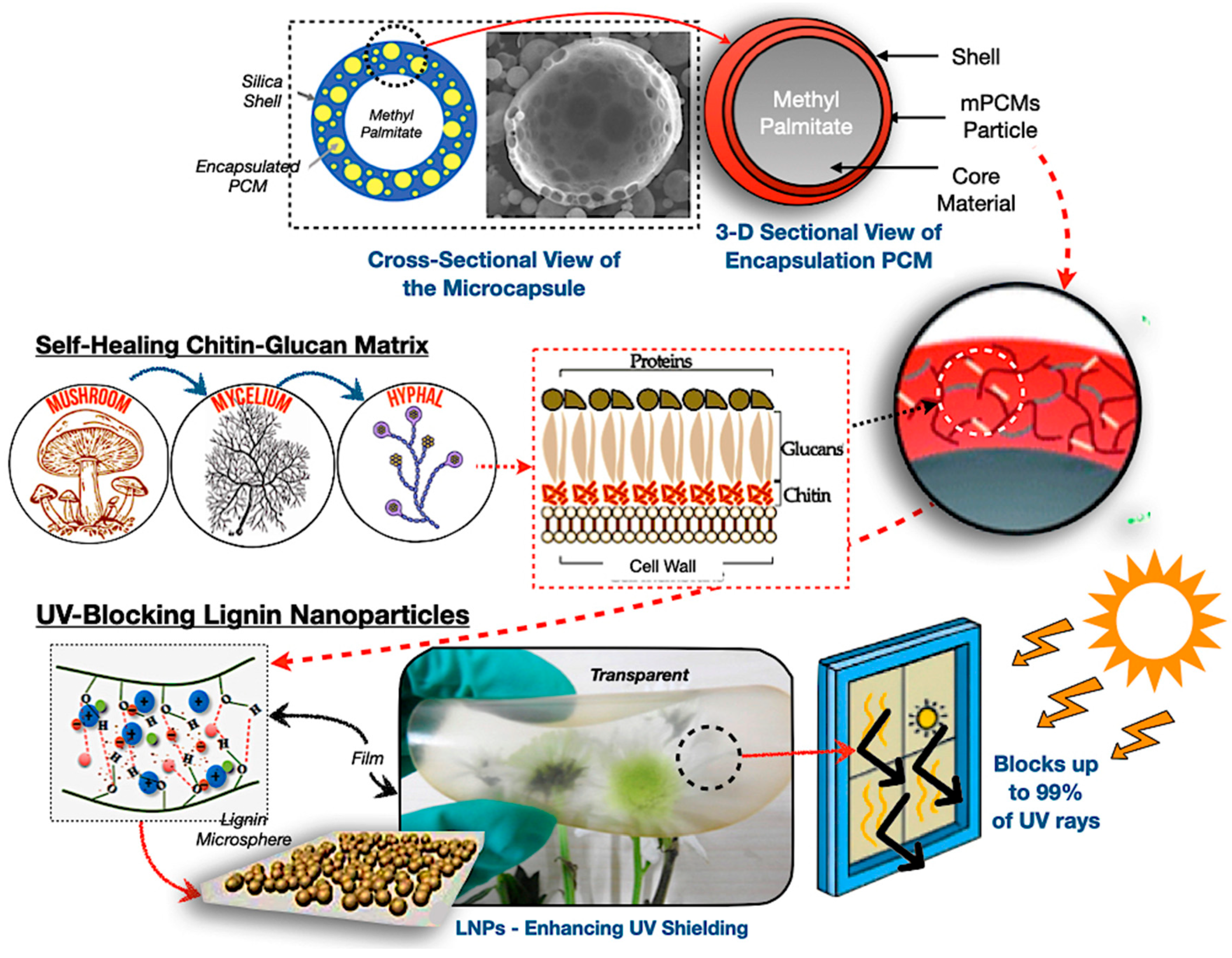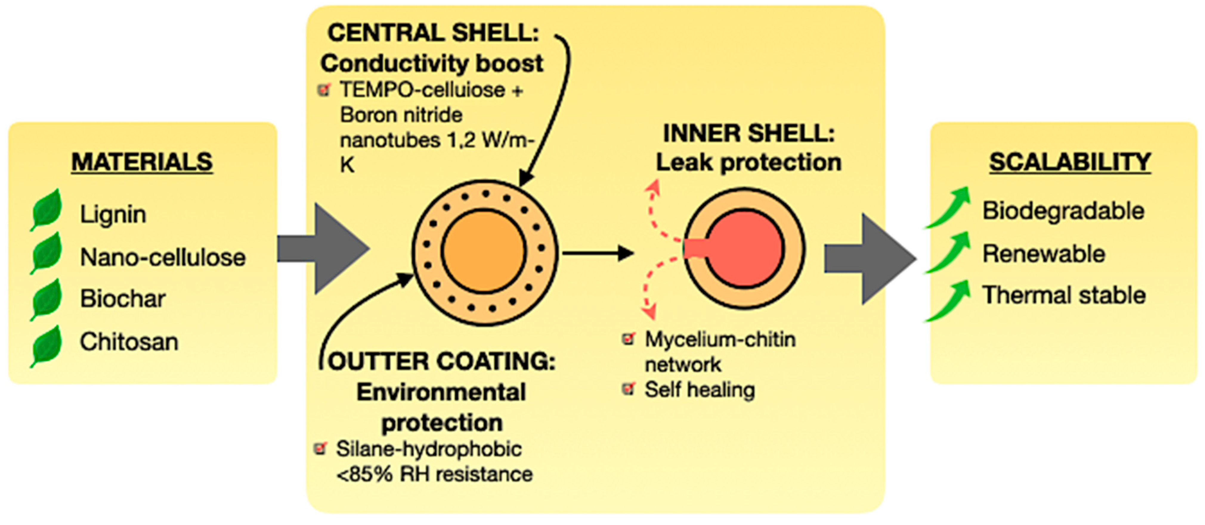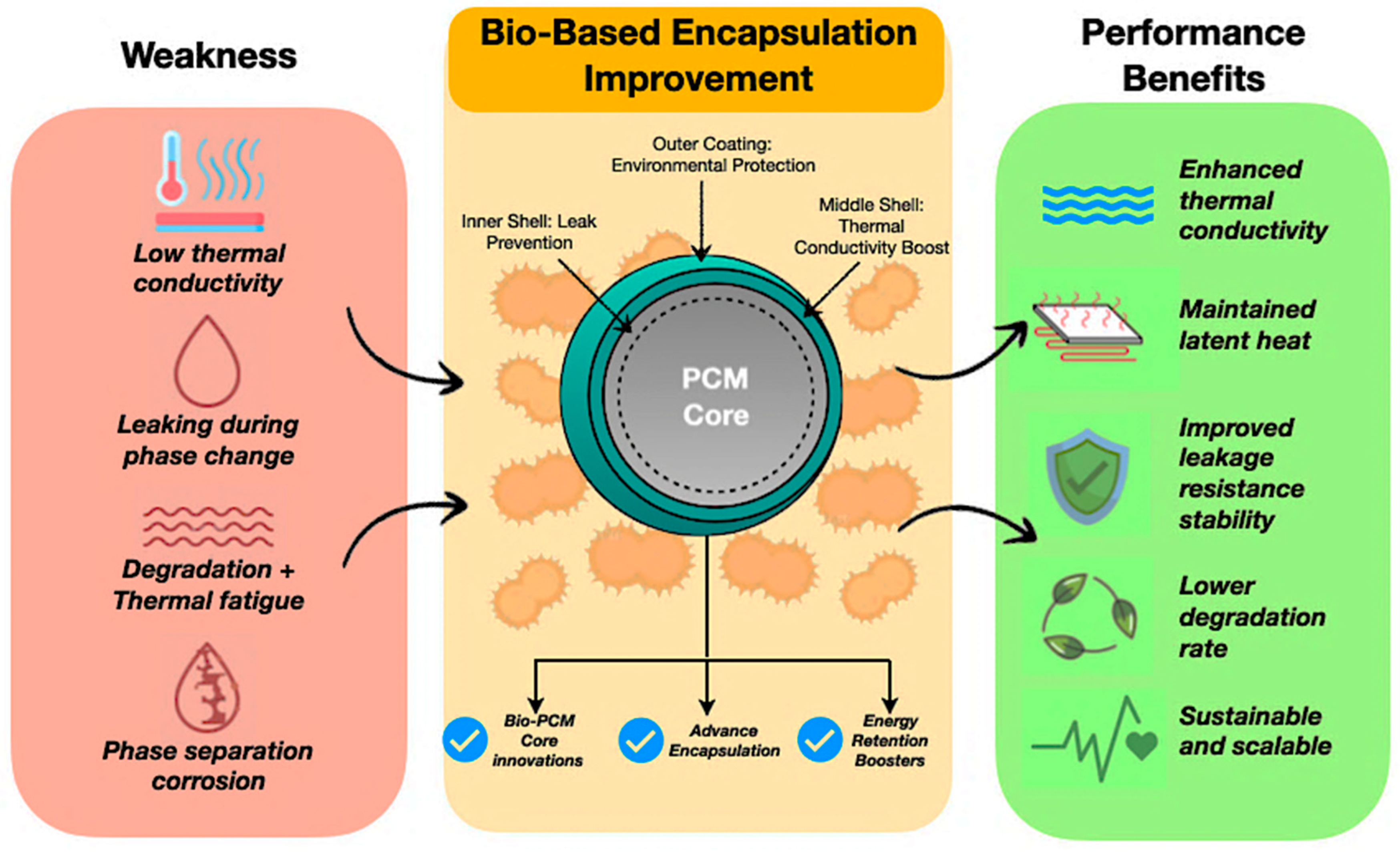 | Microencapsulation | PCM particles (1–1000 µm) coated with polymer or bio-based shells (e.g., chitosan, lignin). |