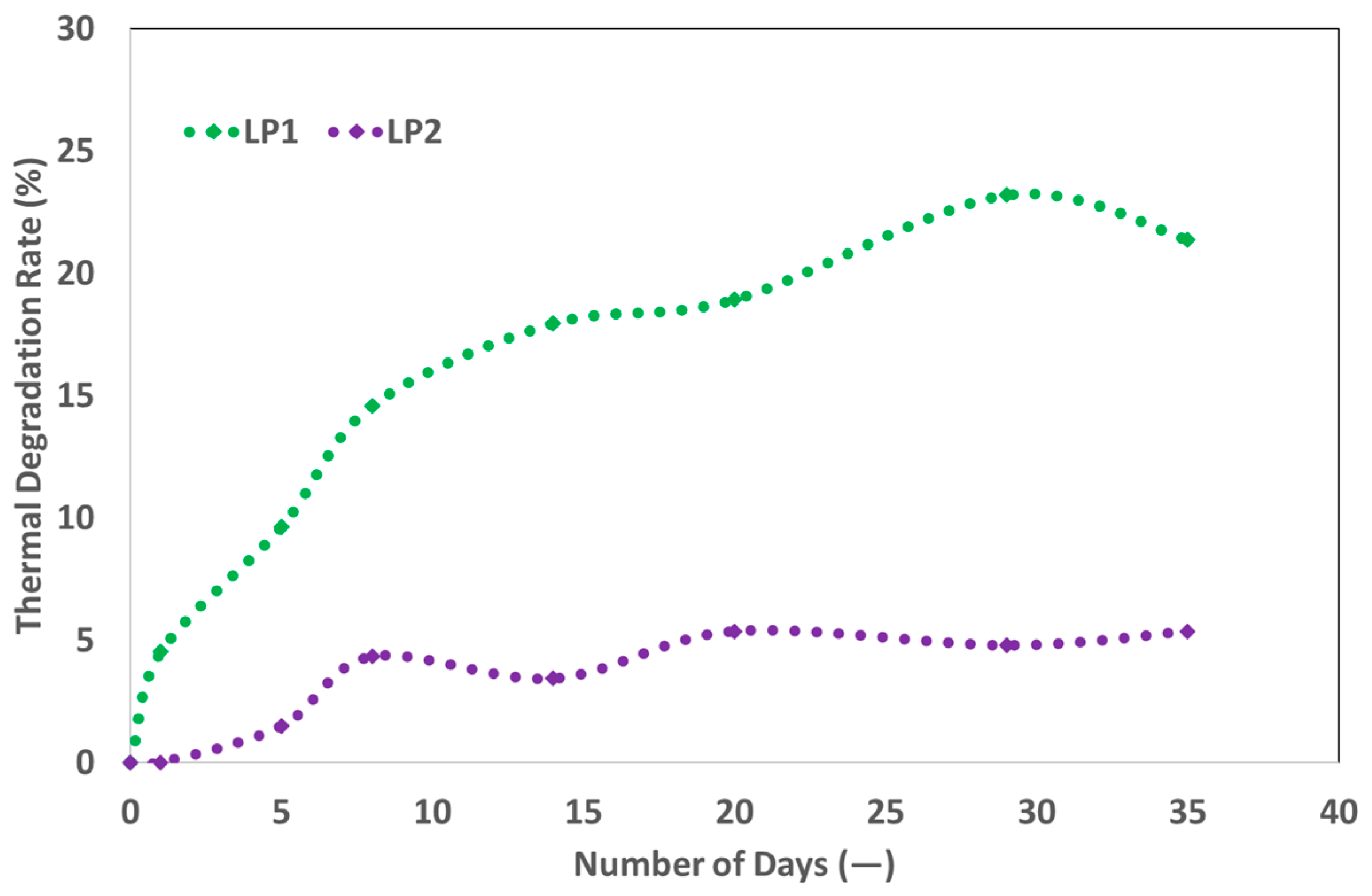 - Rheological and Thermal Stability: All polymers achieved the target viscosity of 20 mPa·s at 20 °C and a shear rate of 7.94 s−1. LP2 showed better thermal stability than LP1, with lower viscosity degradation over 35 days at 36 °C. Powder polymers maintained viscosity across temperature ranges, with PP3 and PP4 showing slightly higher values (21 mPa·s at 20 °C).