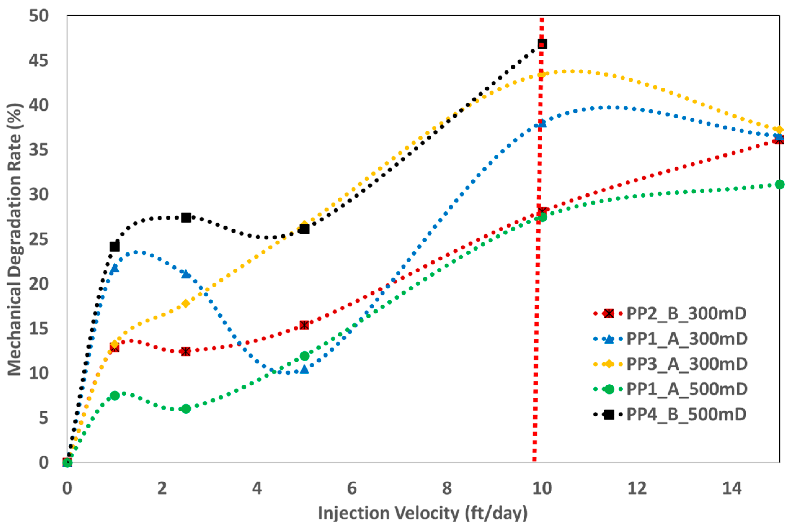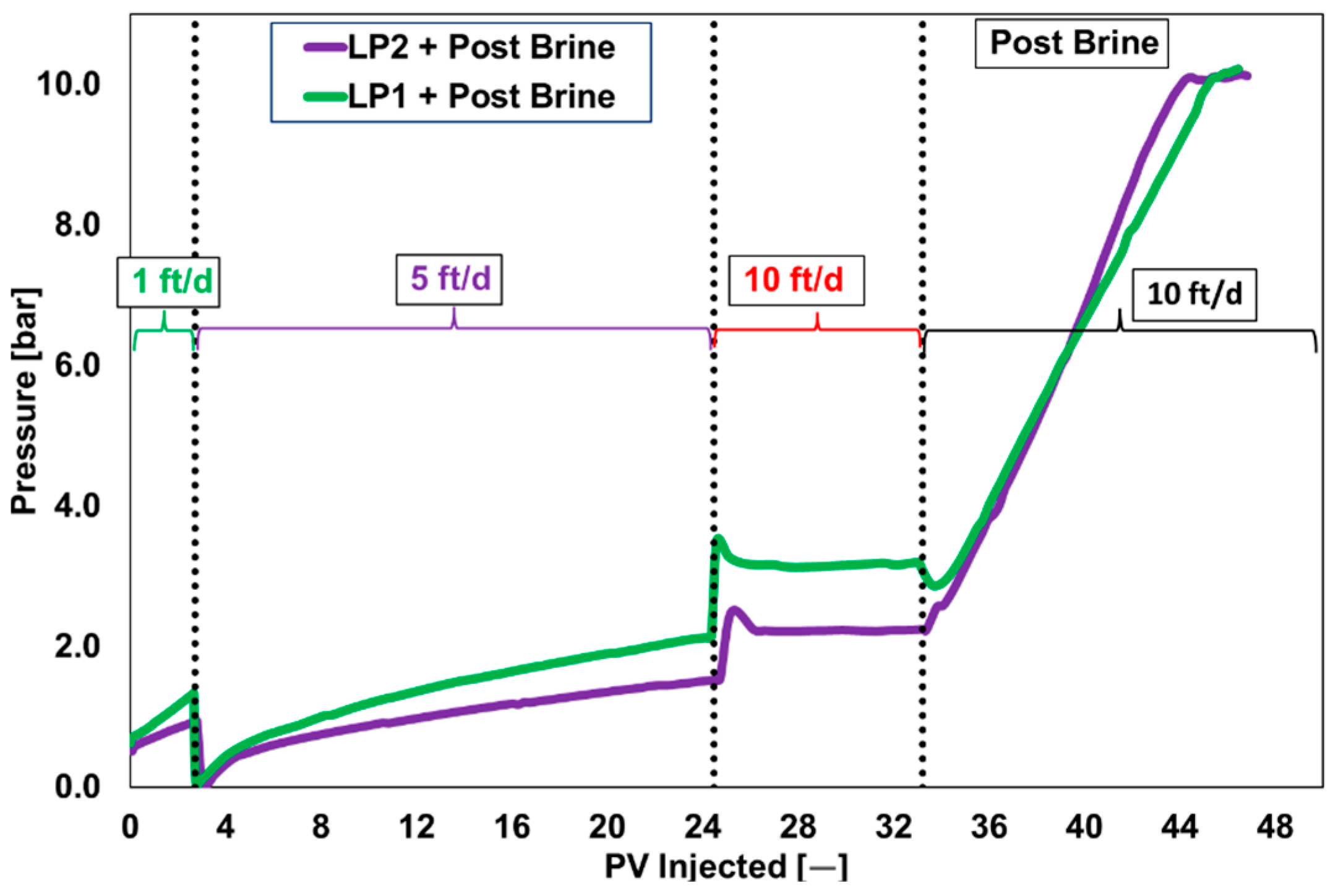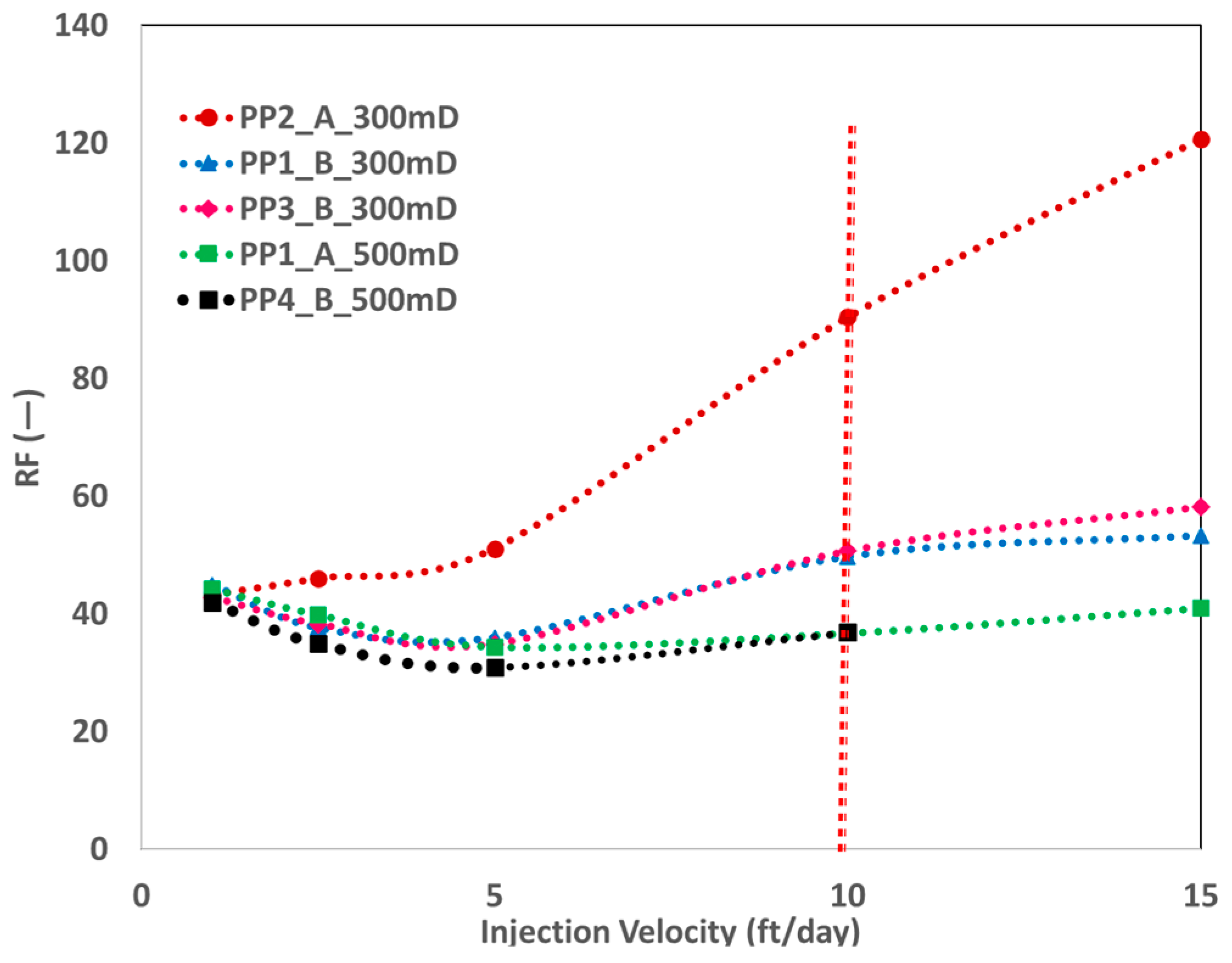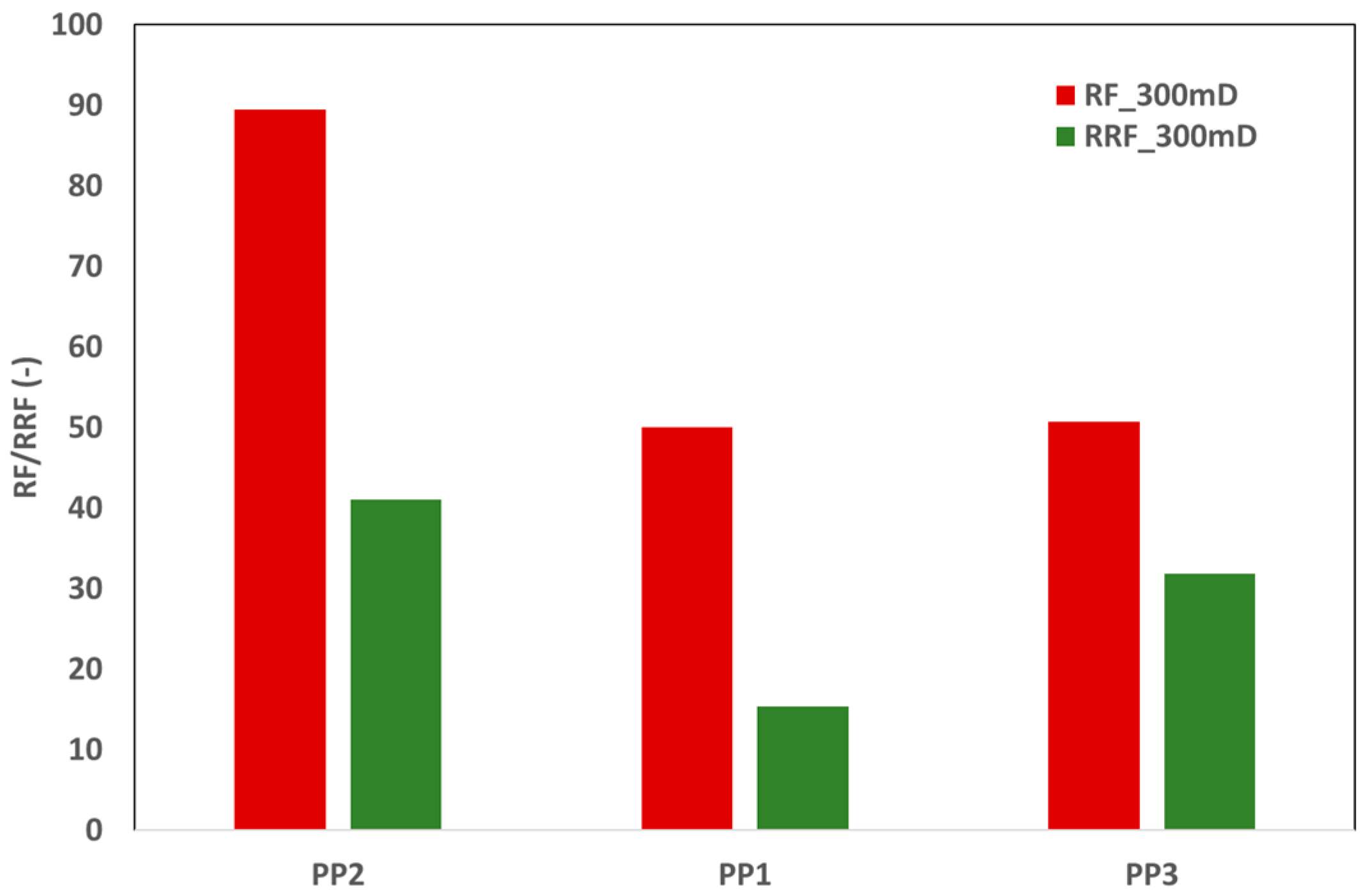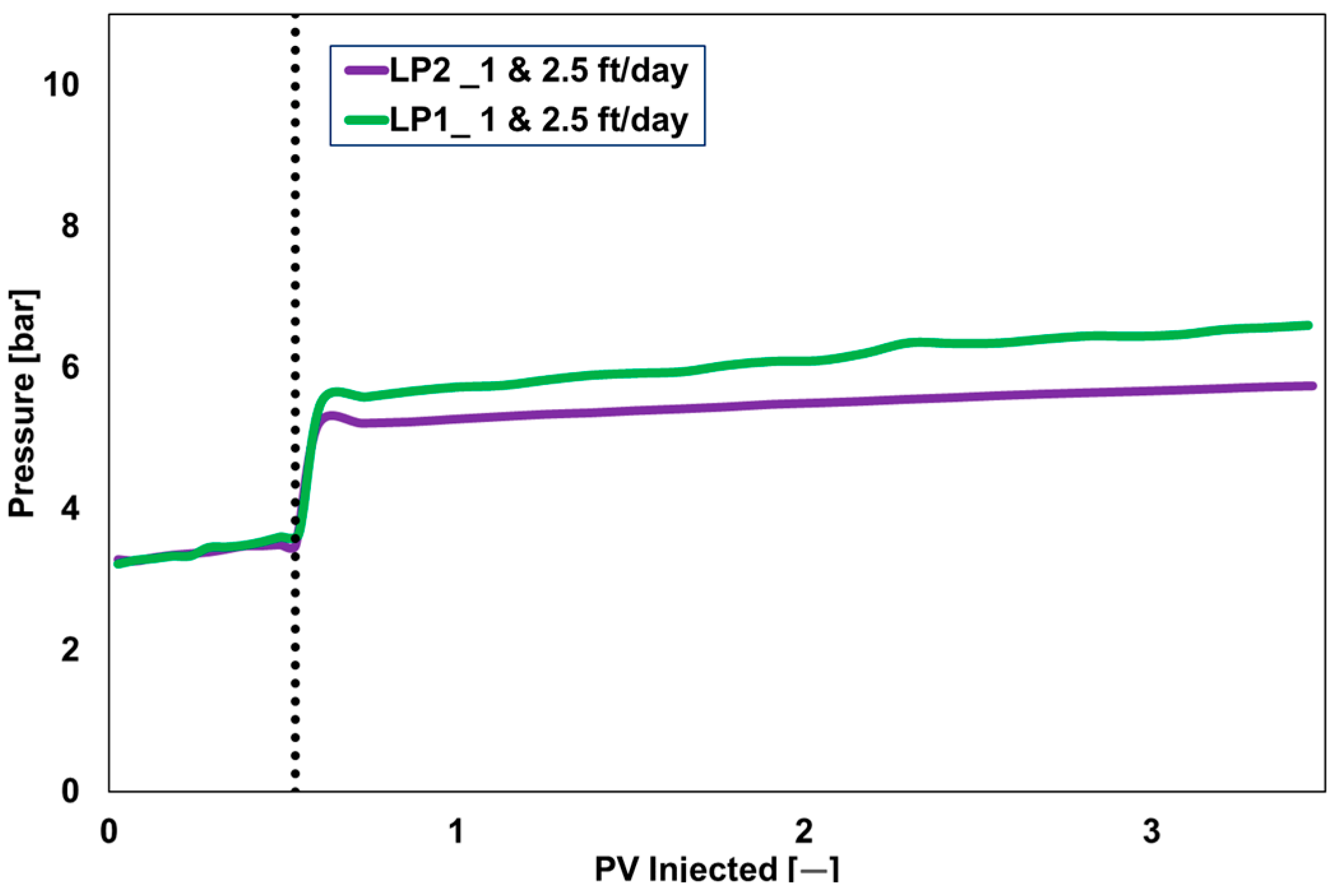 - PP1 and PP2 exhibited similar pressure behavior at low injection rates (1 ft/day) due to comparable viscosities; however, PP2 showed significantly higher pressure differentials at higher rates, likely due to its viscoelastic properties. These findings, derived from controlled laboratory conditions, may not directly translate to field performance.