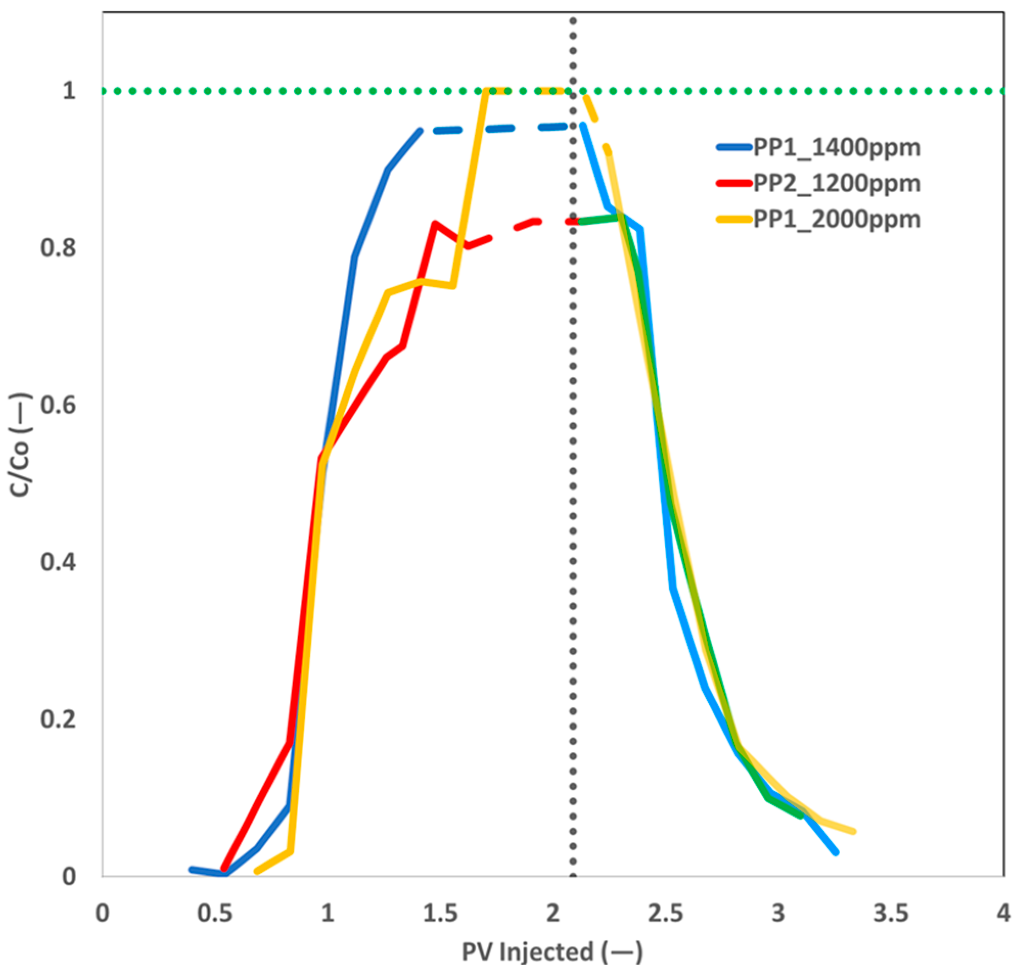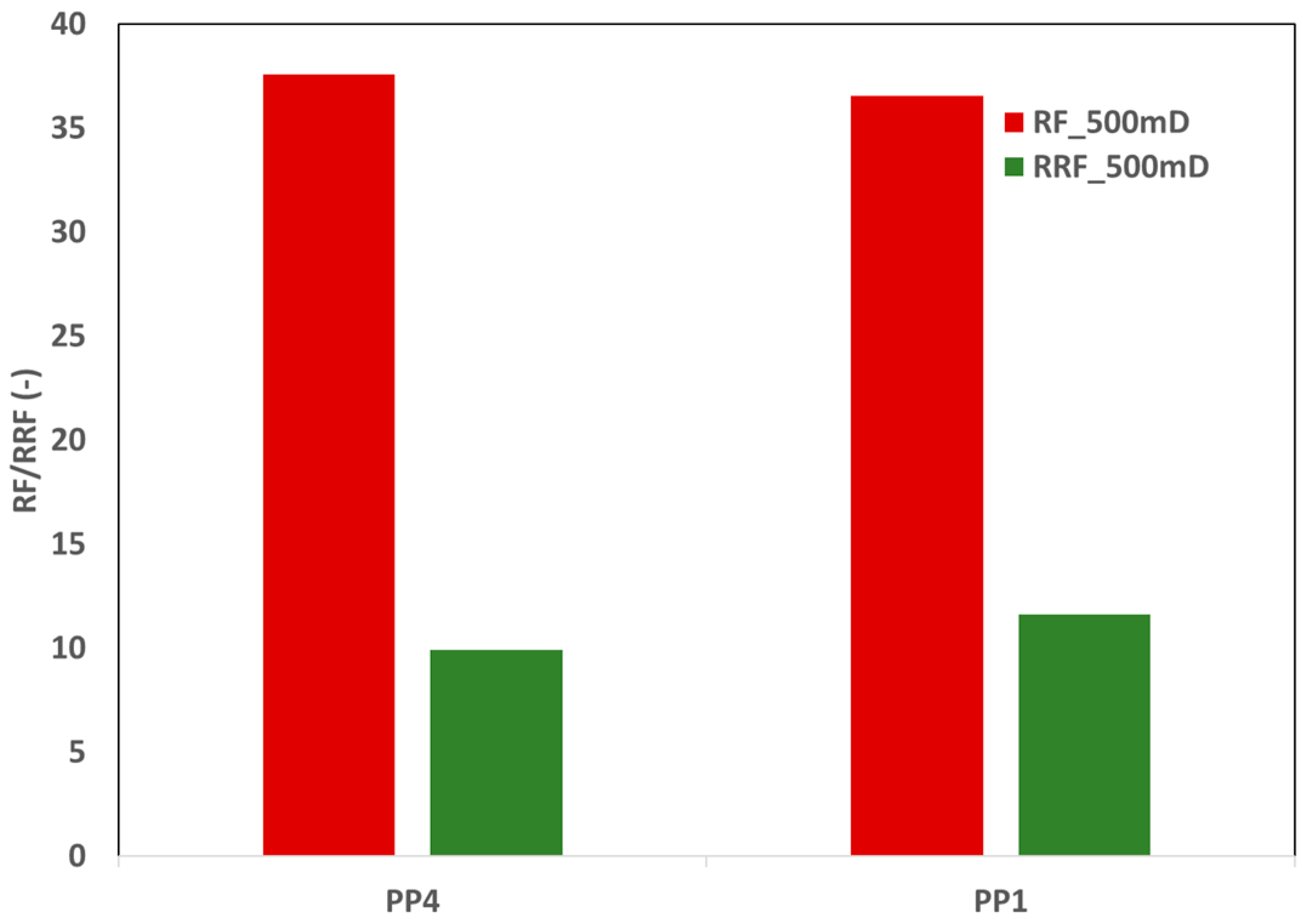 - Recovery Efficiency: Two-phase core floods using PP1 and PP2 at 1 ft/day yielded incremental oil recovery factors (ORF) of 5% and 6%, respectively. A third test with a higher PP1 concentration (2000 ppm) resulted in an ORF of 8%, demonstrating that increased viscosity does not proportionally enhance recovery due to non-Newtonian flow behavior.