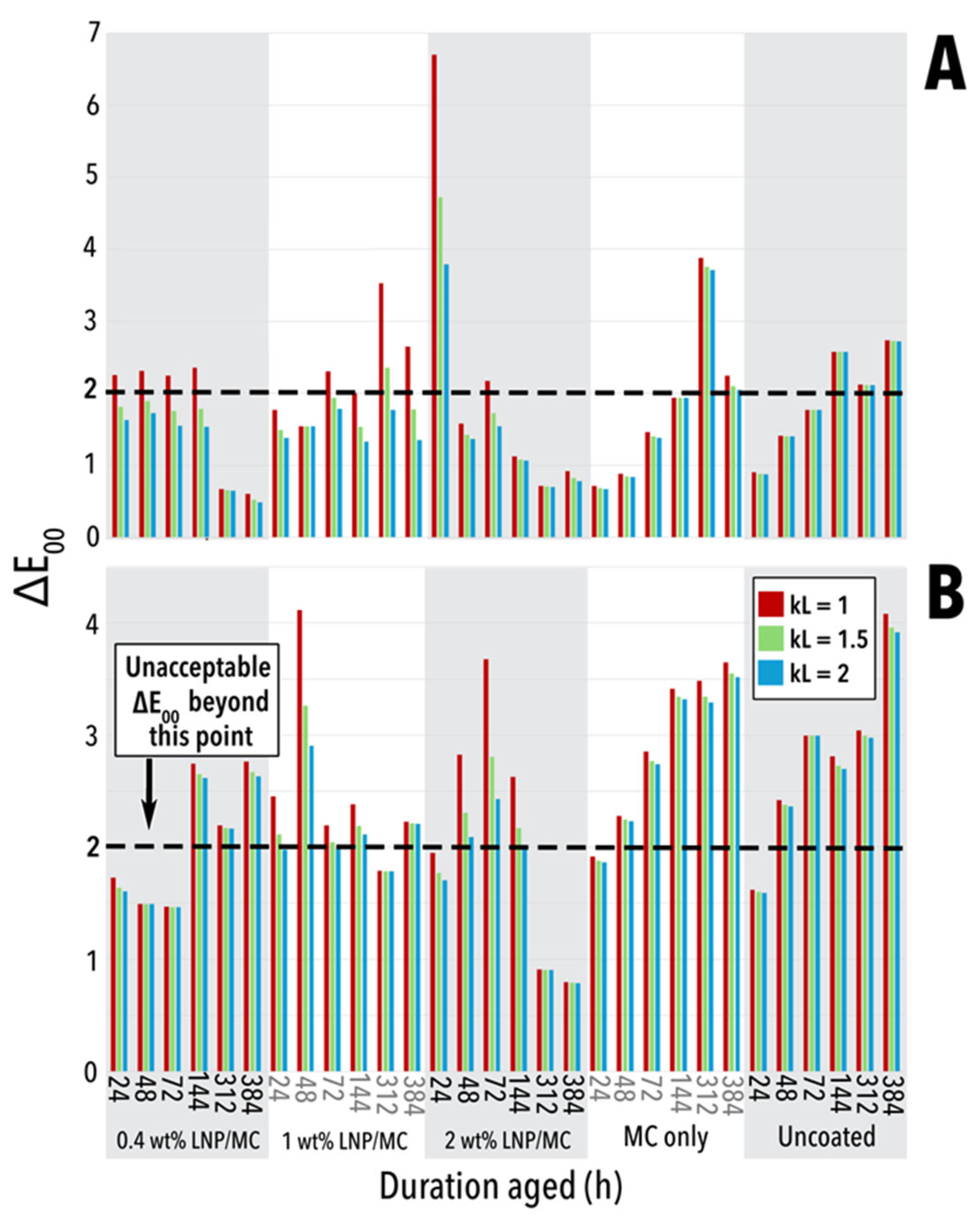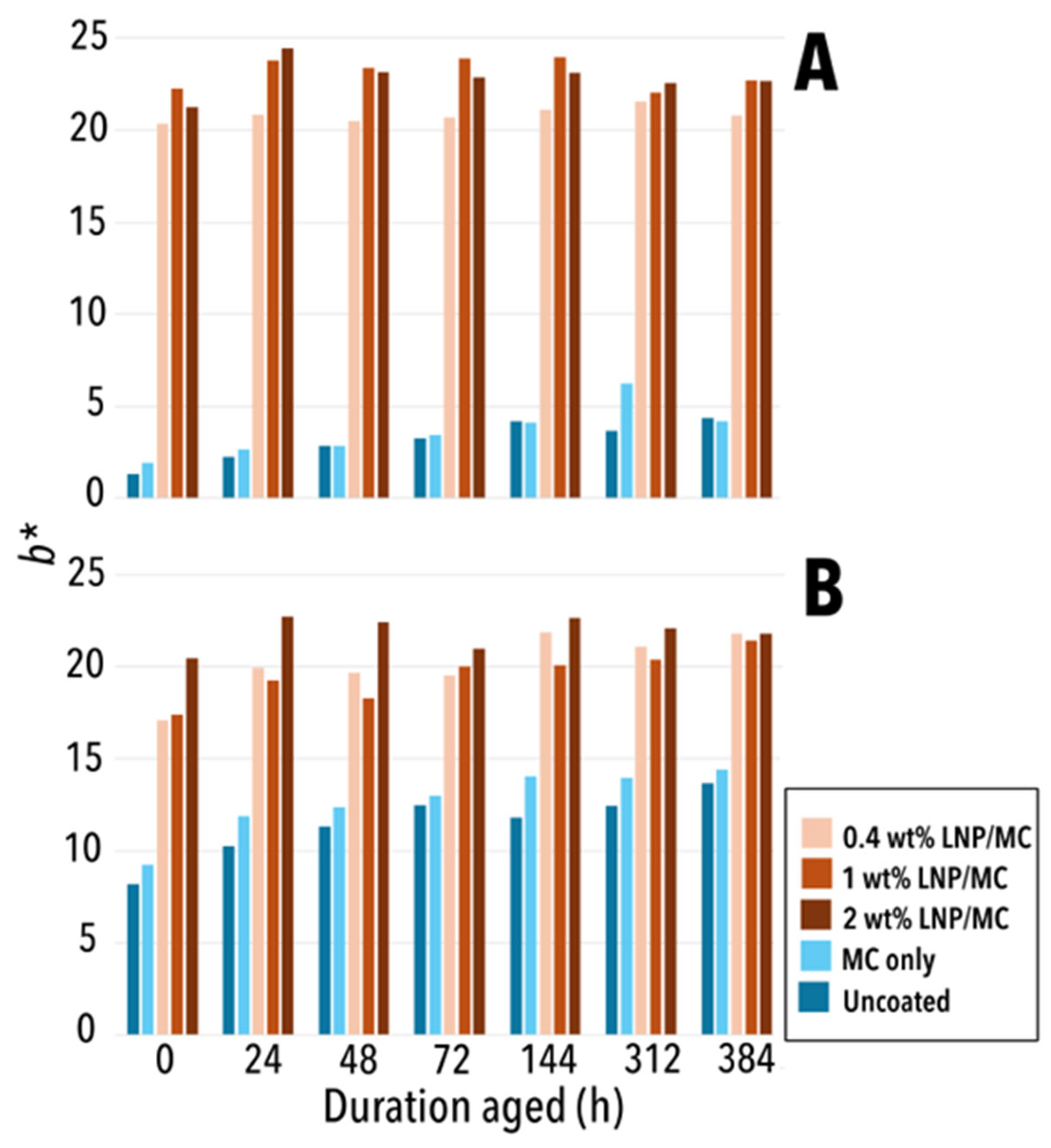 | Cotton, 1 wt% LNP/MC, aged | 642 | 487 | 634 | −24.1 | −1.3 | 0.1 | 0.8 |