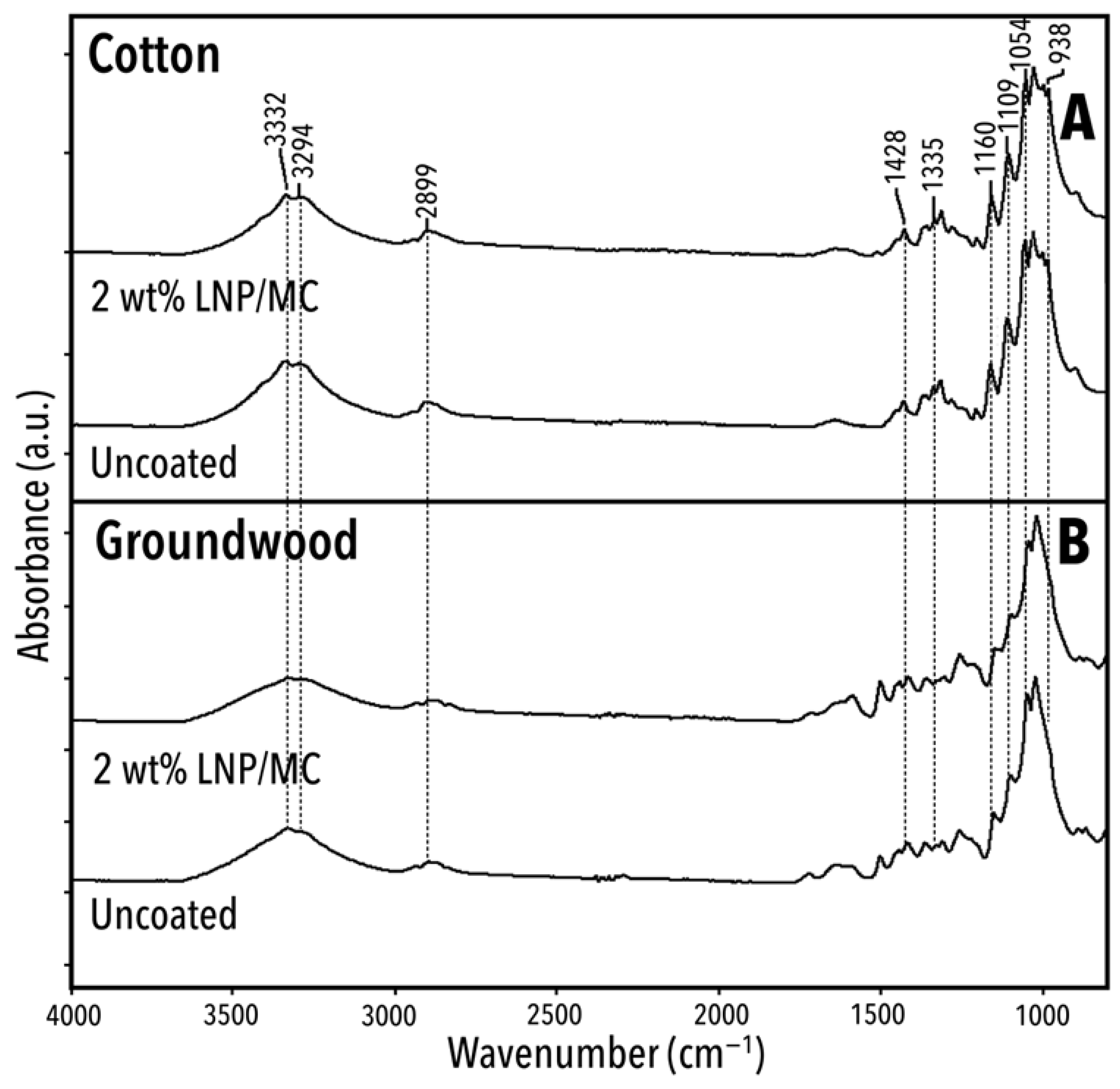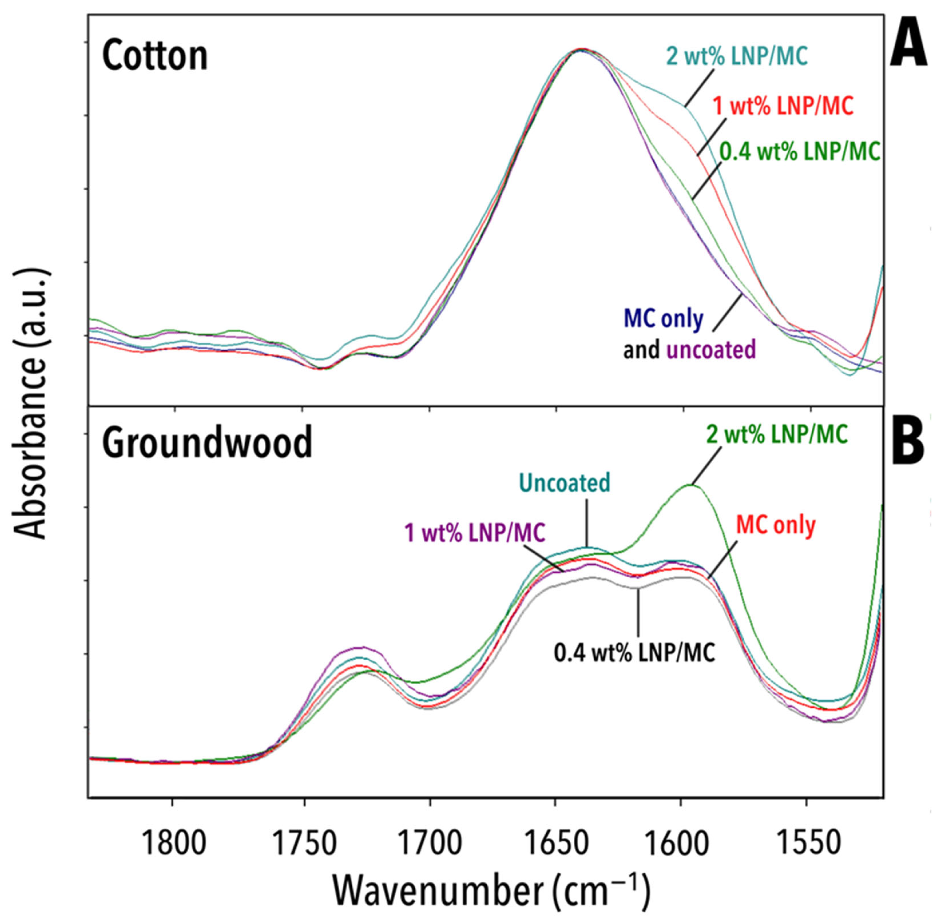 | 1592–1606 | ν(C=C), δ(C-H) | Uncoated groundwood 2 wt% LNP/MC cotton 2 wt% LNP/MC groundwood | Lignin | [64] |