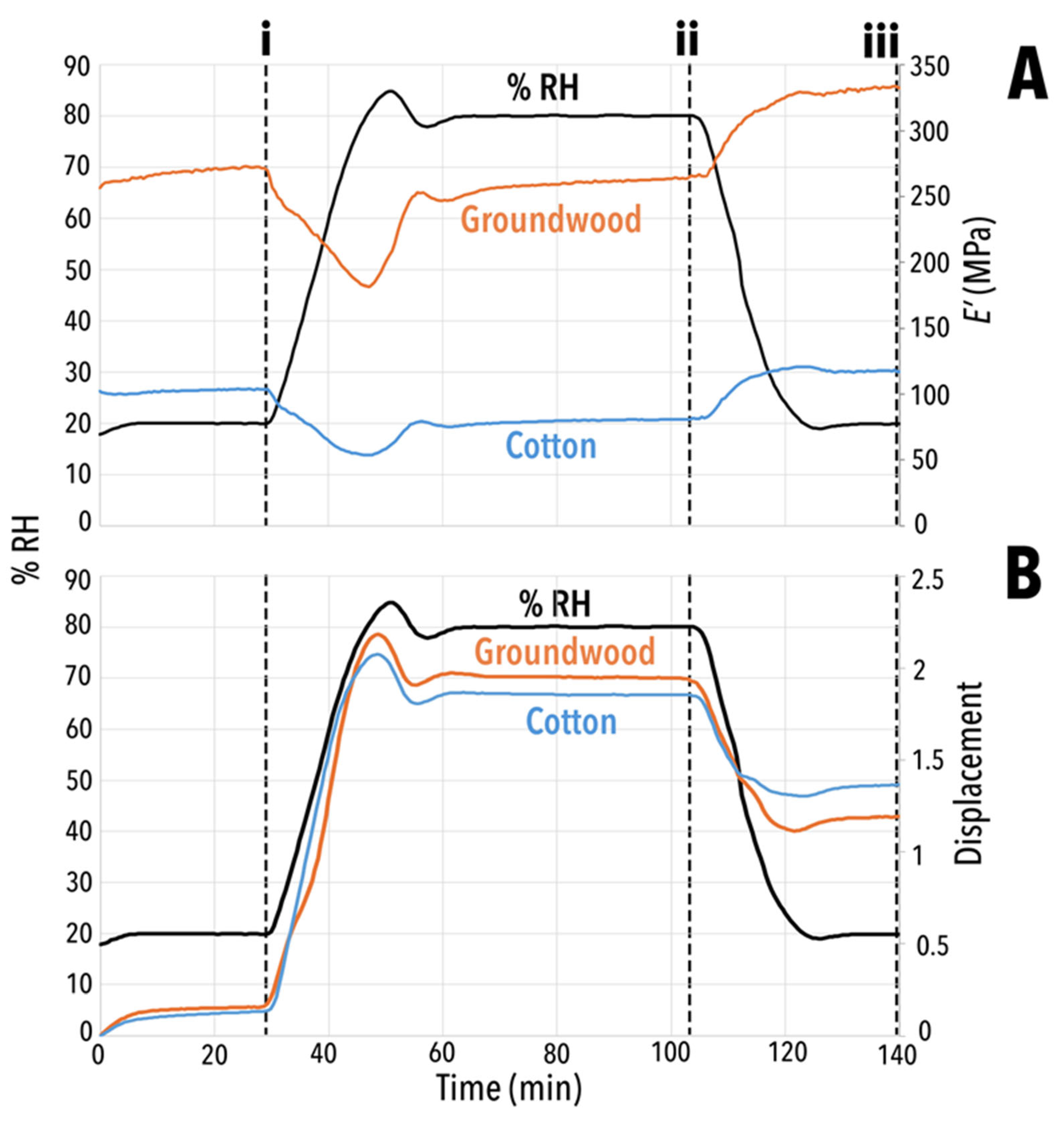 - Gregorova, A.; Lahti, J.; Schennach, R.; Stelzer, F. Humidity response of kraft papers determined by dynamic mechanical analysis. Thermochim. Acta 2013, 570, 33–40. [Google Scholar] [CrossRef]