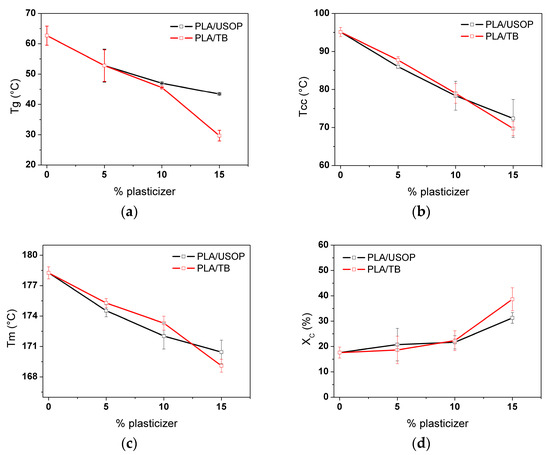 However, it should be noted that the plasticizer concentration also plays a preponderant role in determining these properties: from Figure 1 it is clear that both plasticizers behave in a similar manner at relatively low concentrations (<10% by weight), while at higher concentrations (>10 wt%), TB affects the structure and molecular orientation of the PLA chains more severely than USOP, leading to a greater reduction in molecular interactions. Other authors also reported differences in the PLA crystallization behavior with the concentration of the plasticizer [27].