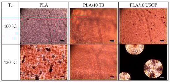 POM images after crystallization from the melt for 5 min, at different Tc for PLA, PLA/10 TB and PLA/10 USOP. The scale bar represents 10 µm.