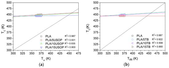 Extrapolation and fitting of the Hoffman and Weeks Equation for: (a) PLA and PLA/USOP plasticized materials (b) PLA and PLA/TB plasticized materials.