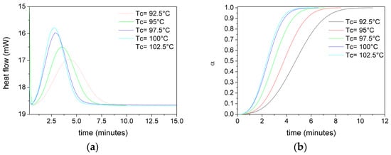 Figure 5 shows, as an example, the heat flux versus time (a) and relative crystallinity (α) versus time (b) curves at different TC for PLA films without plasticizer.