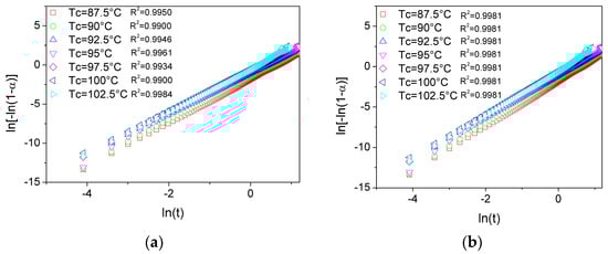 To gain deeper insight into the evolution of crystallinity during isothermal crystallization, the Avrami model was applied to analyze the crystallization kinetics of PLA and its plasticized blends. As shown in Figure 6a,b, the experimental data plotted using the linearized form of Equation (2) exhibit an excellent alignment, indicating that the proposed linearization provides a valid and consistent representation of all investigated systems. The kinetic parameters obtained for each formulation, including the Avrami exponent (n) and the overall crystallization rate constant (Zt), are summarized in Table 2.