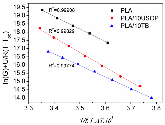 Table 3 presents the values of the nucleation constant for all the materials studied. Consistently with the results obtained by POM, PLA/10 USOP has the highest KG value, indicating the lowest nucleation rate compared to the rest of the materials studied in this work and for the analyzed temperature range.