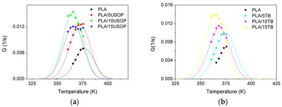 From Figure 8, it can be observed that the materials containing both plasticizers exhibit similar behavior to that of neat PLA over the entire temperature range in which it can crystallize. In the case of materials with TB, the temperature corresponding to the maximum crystallization rate shifts to lower values compared to pure PLA, and at the same time, the overall crystallization rate increases as the TB percentage increases. This trend is consistent with the increased mobility of the plasticized polymer chains and their higher nucleation rate. In contrast, for the USOP-plasticized materials, a less pronounced effect on the temperature of the maximum rate is observed, which also agrees with the lower plasticizing effect provided by this additive and previously reported by the group [22].