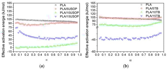 Effective activation energy profiles for: (a) PLA and PLA/USOP plasticized materials and (b) PLA and PLA/TB plasticized materials.