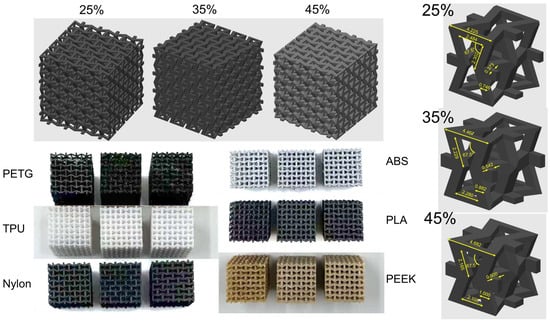 Solid tensile specimens were fabricated according to ASTM D638 [] Type I dimensions (overall length of 165 mm, gauge length of 50 mm, width of 13 mm, and thickness of 3.2 mm). The tensile specimen is flat in printer’s X-axis. The infill pattern was a 45° grid along the X-direction. The nozzle size is 0.4 mm. The layer height is 0.3 mm. The perimeter count is set as 1. Compressive specimens measured 32 × 32 × 32 mm and were produced at RDs of 25%, 35%, and 45%, respectively. The specific structure [] can be found in Figure 2.