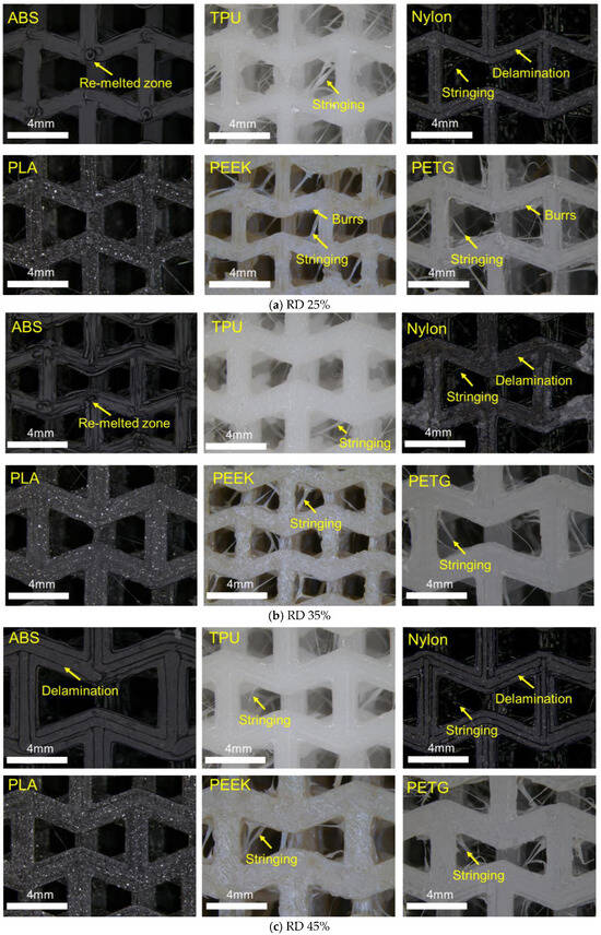 Enlarged graphs of the 3D-printed samples at different RDs (25%, 35%, and 45%) are shown in Figure 3. At 25% and 35% RD, the ABS sample exhibits a pronounced re-melted zone due to the nozzle passage for the realization of the layer, while at 45% RD, these zones disappear, and delamination is observed. The visible delamination arises because the print head did not extrude sufficient material to fully fill the framework of the individual section in a single pass (i.e., under-extrusion). Such under-extrusion can result from the nominal extrusion settings (flow/extrusion multiplier, print speed, and temperature) and from the intrinsic rheological properties of the filament (melt viscosity, fillers/additives, and feed behavior). Nylon samples show persistent delamination across all RDs. TPU, PEEK, and PETG samples display extensive stringing with burr formation. As RD increases, both the types and severity of defects exhibit slight differences. These defects may compromise the material’s mechanical performance.